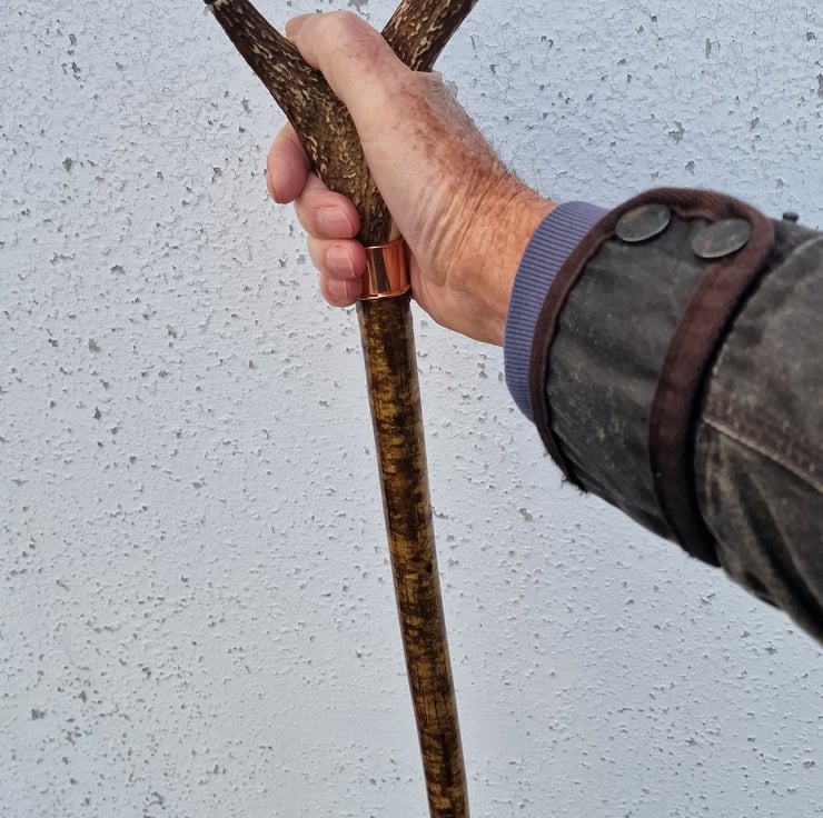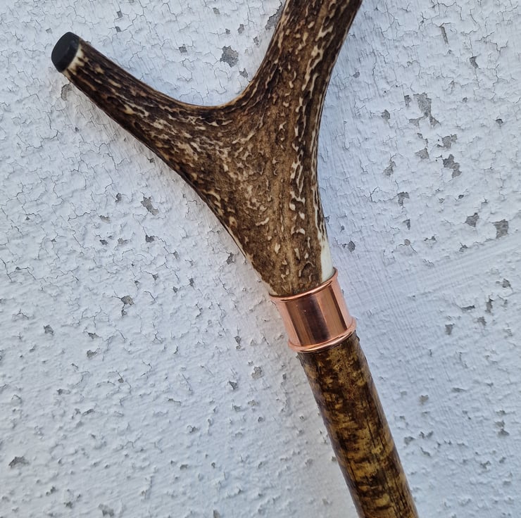 Antler Thumbstick, Walking stick, Hiking staff, Shooting stick. Deer antler handle with Buffalo horn capped tines and a copper rolled edge joint collar. Beautifully hand crafted from ethically sourced natural materials, this Welsh Hazel hiking staff was harvested and seasoned for two full years before being lovingly transformed into a fabulous and very pretty hiking staff. Hand finished with two coats of gloss varnish. 52.5 inches (133cm) from the bottom of the thumbrest 'V' in the antler handle, to the tip. 1 inch (25mm) diameter under the collar, tapering to 3/4 inch (19mm).