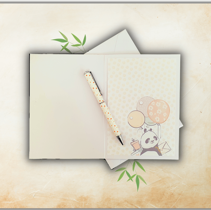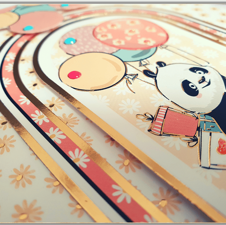A lovely, handmade birthday card featuring a panda holding presents and balloons, in soft pastel colours.