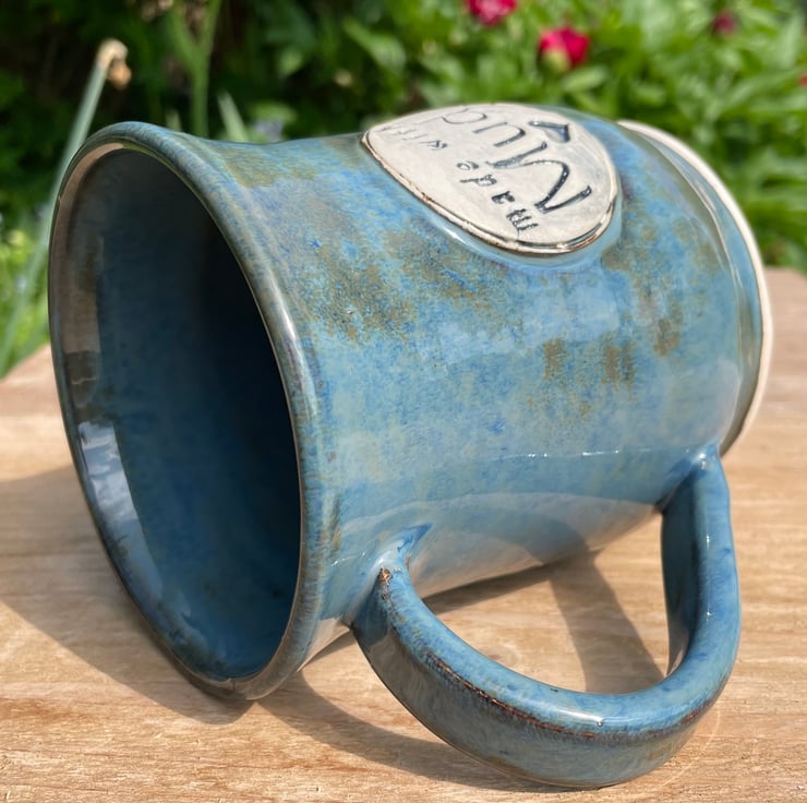 The mug was dried slowly once the handle was added, over a few weeks. It was then fired to over 1000°c in a bisque firing. It was then glazed and fired again over 1200°c.