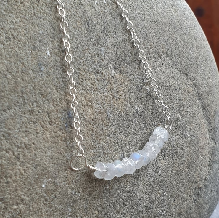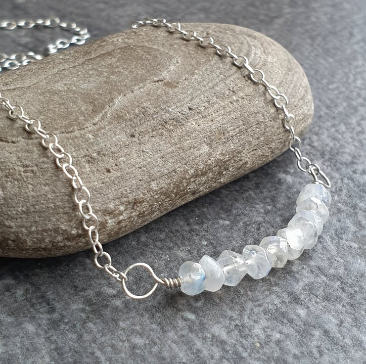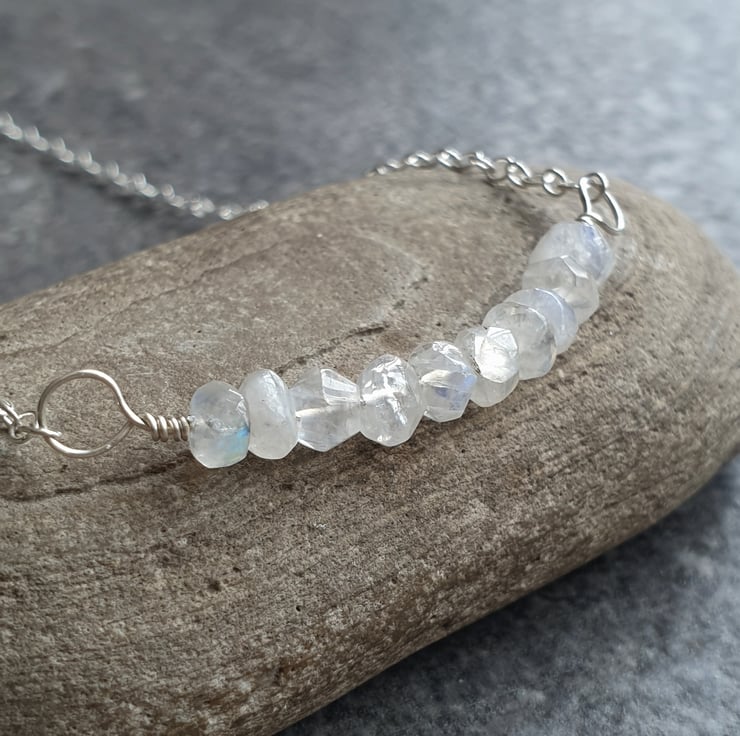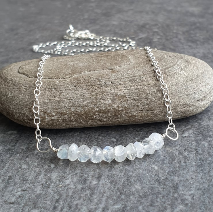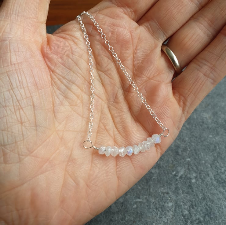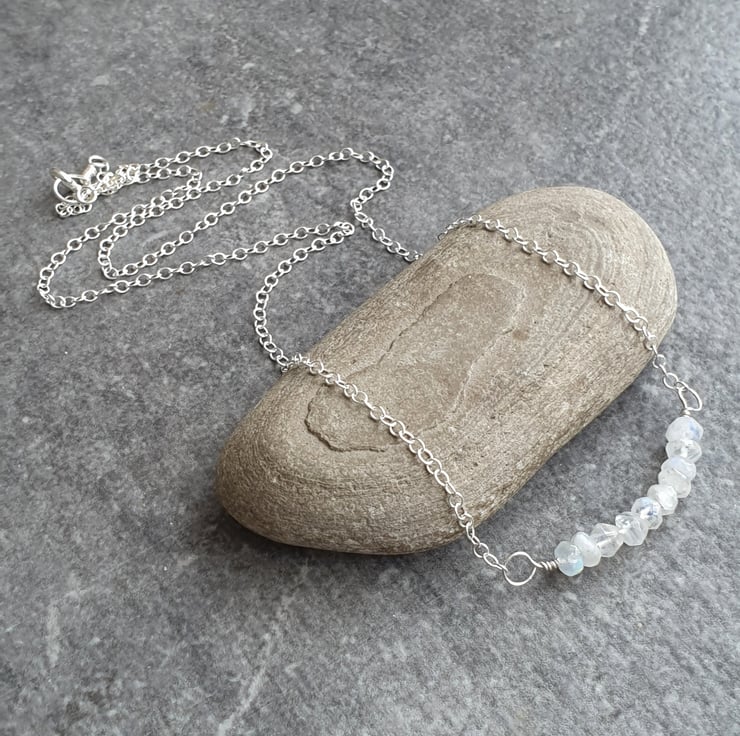 This dainty moonstone necklace features a row of facet cut moonstone beads arranged on a sterling silver wire, with sterling chain on either side to make it into a bar pendant. Perfect for layering up with others or just on it's own, this minimalist necklace goes with everything!