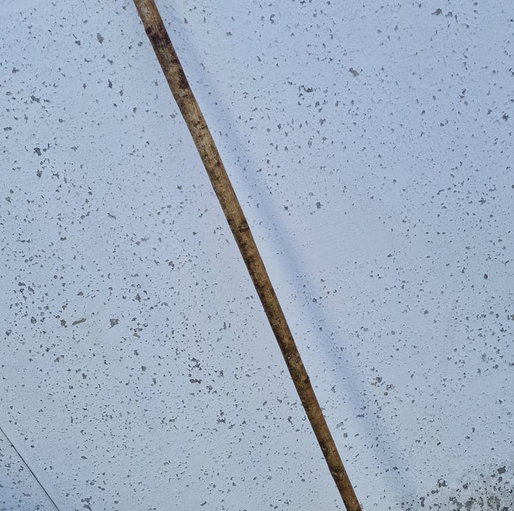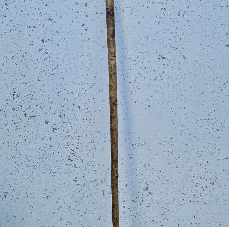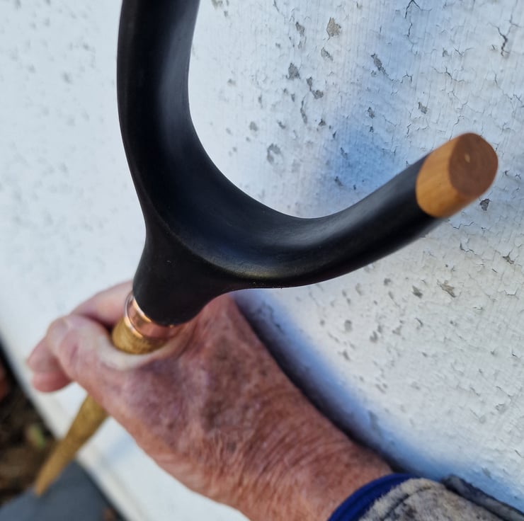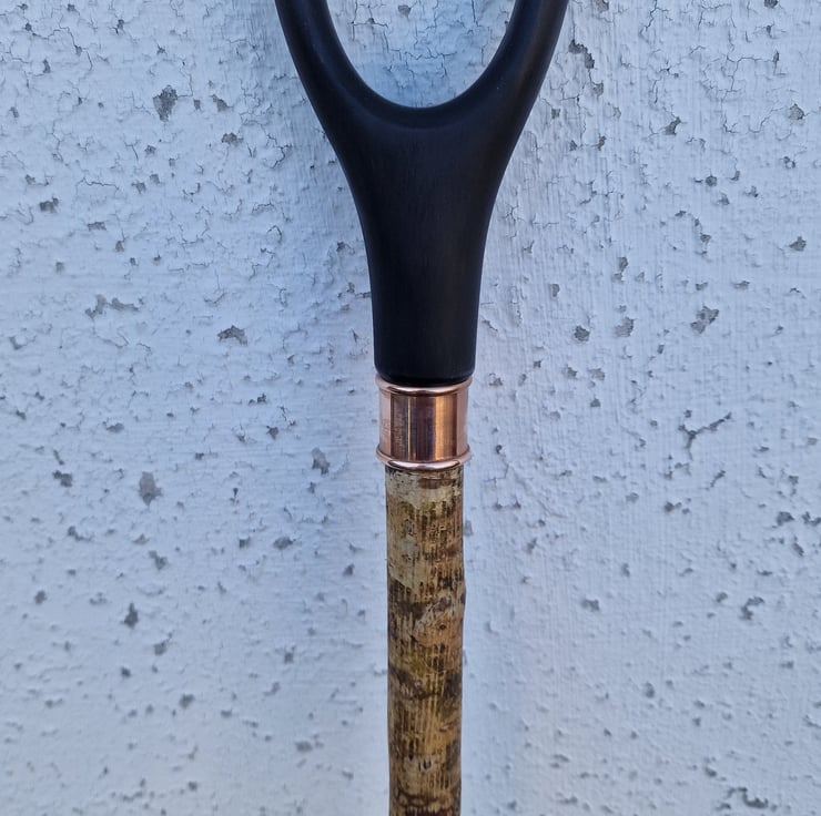 Horn handle thumbstick, Walking stick, Hiking staff, with a Buffalo horn handle capped with Blackthorn wood, with a polished copper joint collar. This beautifully hand crafted, Welsh mottled Hazel staff is a very attractive, distinctive, and individual piece, and certain to draw admiring glances, or become conversation piece! The shank has been seasoned for two years, steam straightened, and coaxed into revealing its natural beauty before being finished with two coats of clear, matt varnish to waterproof it. The Water Buffalo horn handle was shaped by hand before fitting to the staff using long standing, and time proven traditional methods, left unpolished with a matt finish, then the ends were capped with Blackthorn wood caps. The joint is strengthened by the addition of a polished, copper joint collar. The staff is 50 inches (127cm) from the bottom of the 'U' handle, and approximately 7/8th inch (2.2cm) under the collar, tapering to approximately 3/4 inch (1.9cm)