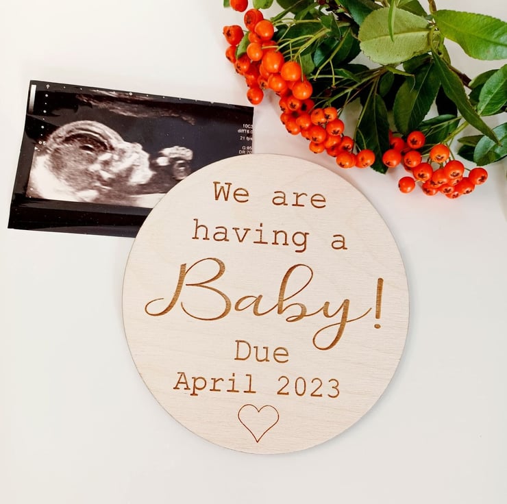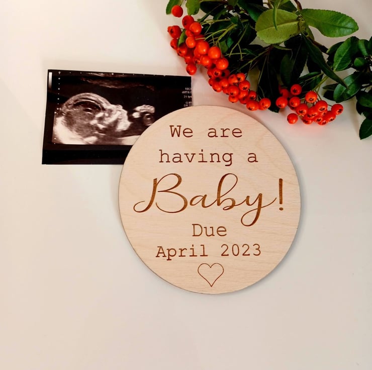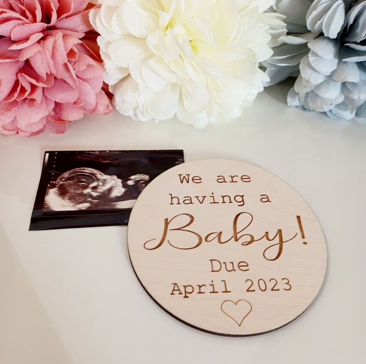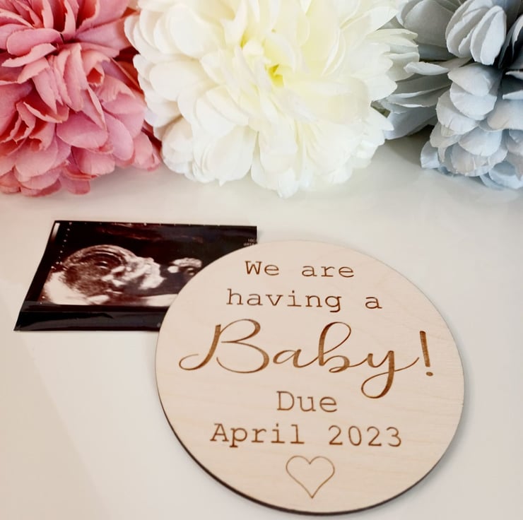 This beautiful wooden disc is a perfect way to announce your exciting news!