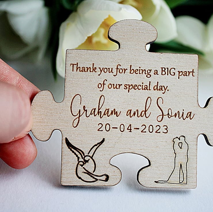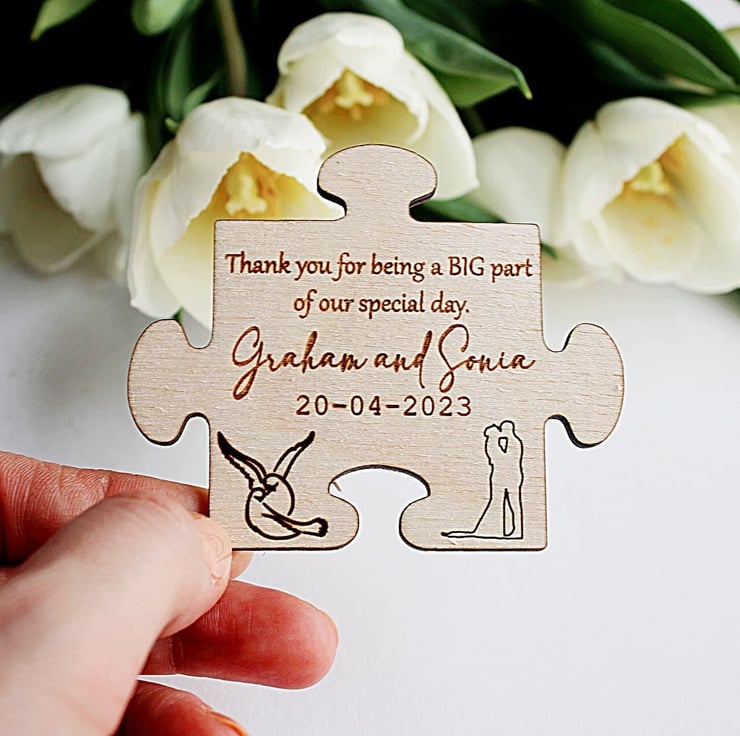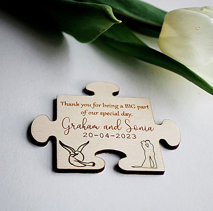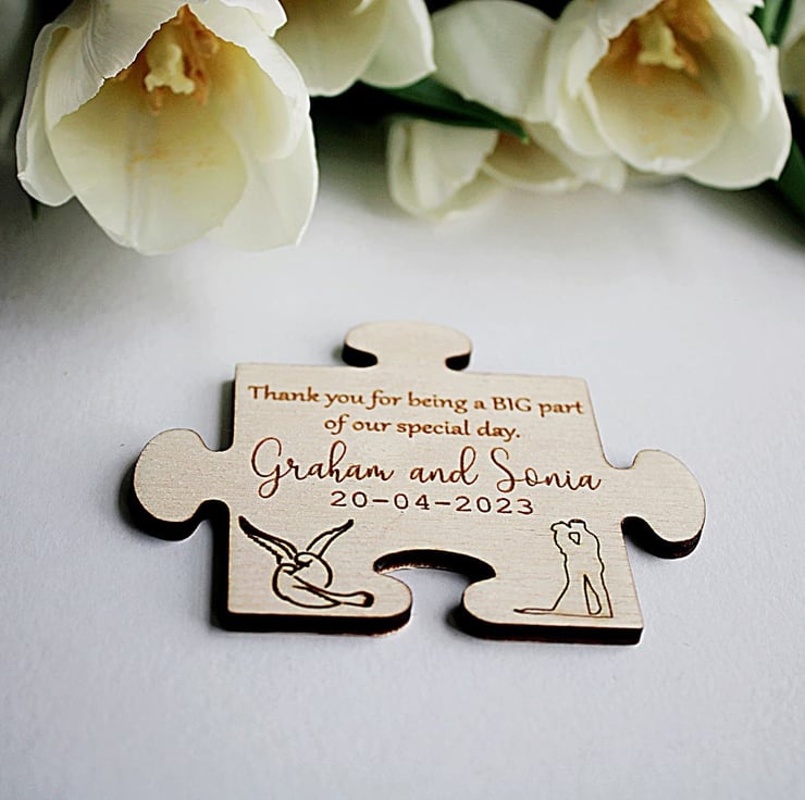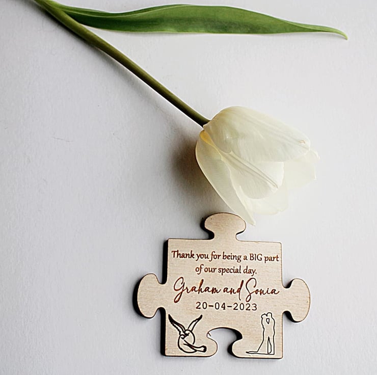 - Customizable: The favors can be customized in a number of ways to make each piece unique to your preference. If you have specific ideas in mind for your puzzle favors, please reach out to us and we'll do our best to bring your vision to life.