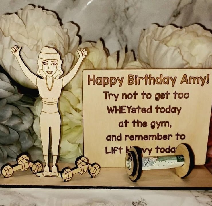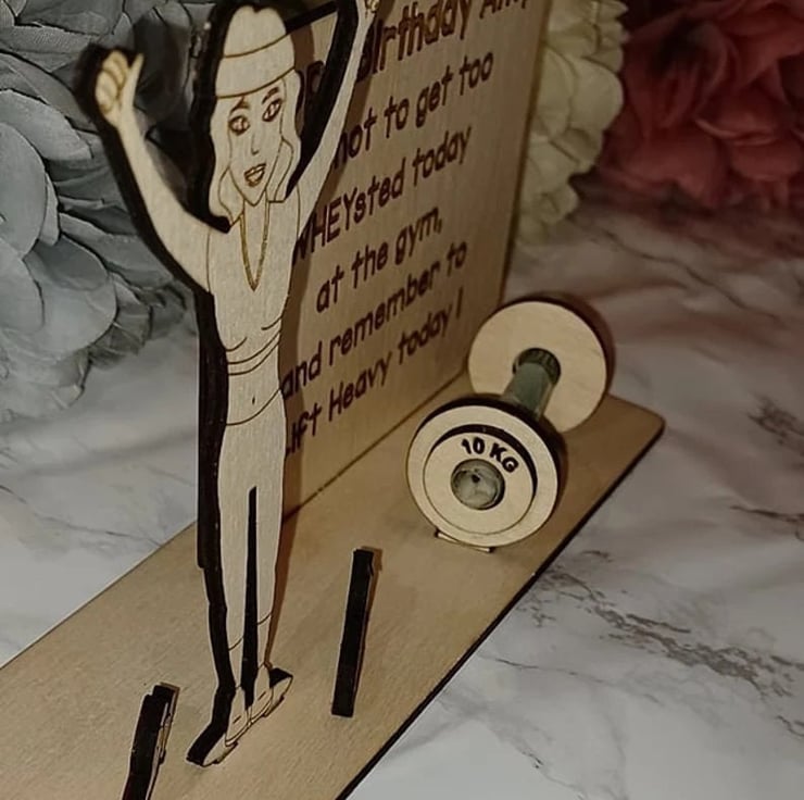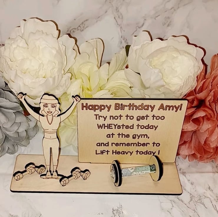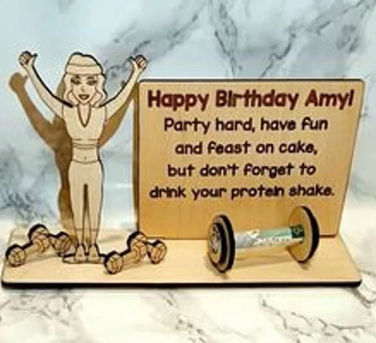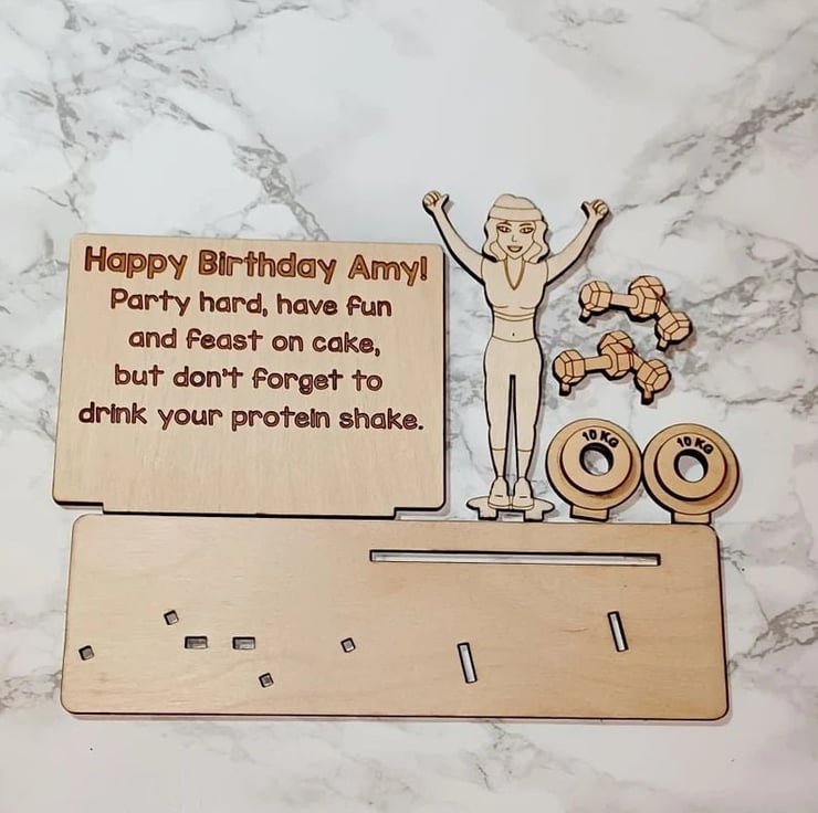 Fanatic about sport? This Personalised Money Holder is the ultimate accessory. Featuring the illustration of a fitness woman surrounded by weights, handcrafted from 3mm of high-quality birch plywood, this Money Holder is one of a kind. Personalised to your specific requirements, including the name of recipient and any message you wish to use. Its the perfect device for conveniently keeping notes securely together. The ultimate gift for gym lovers, fitness girls and sports people, its great for all occasions, including birthdays, a retirement present or just a little something to brighten your friends day! Carefully crafted, measuring 20cm in width and approximately 12cm in height, this item is both high-quality and guaranteed to last. Our Personalised Money Holder will make a welcomed addition to any home, a great keepsake and a potential initiative to save some money - if its not already been spent on sports equipment!