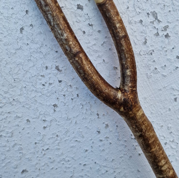 Beautifully mottled Hazel Bark along the entire length. The tips of the handle tines have been cut, peeled and made ultra smooth. Hand rubbed with natural raw linseed oil and beeswax polish that I make to my own recipe. Quite unique!