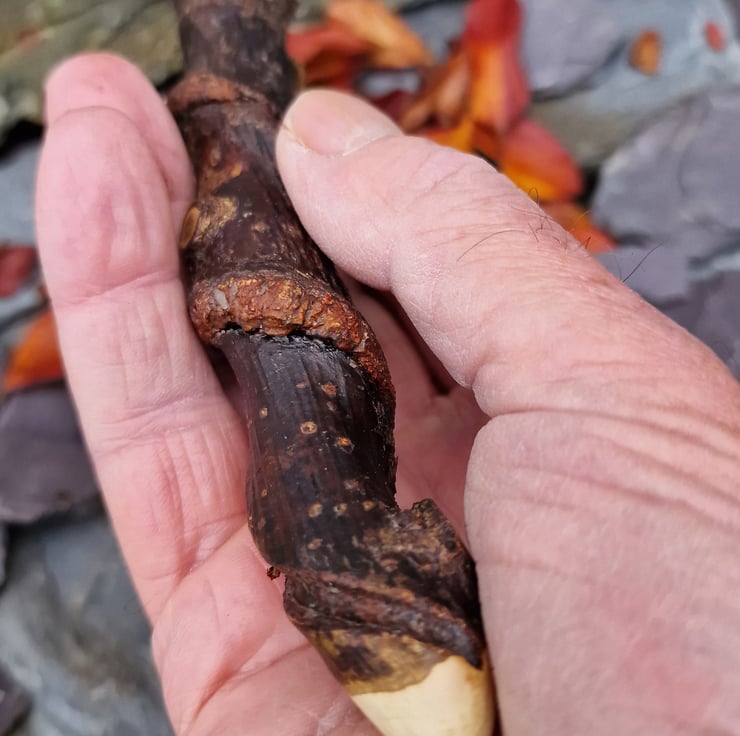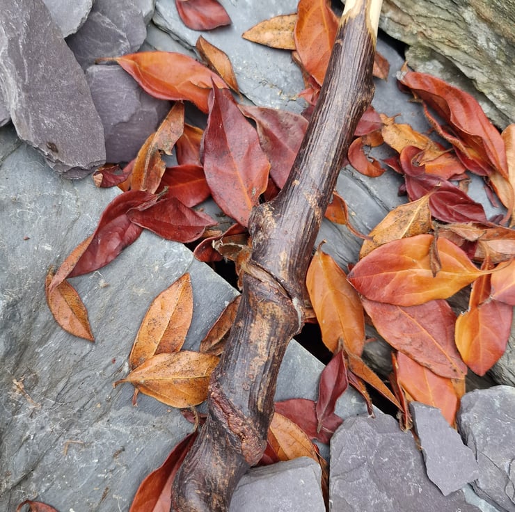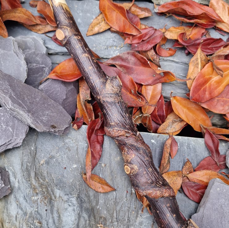 Carefully harvested from its Mother tree three and a half years ago, seasoned for two full years, then transformed almost 18 months ago. This piece was always destined to become this wonderful wand. Most of the invading Wild Honeysuckle that entwined the young Hazel shoot, remains permanently embedded and united forever. The colouring of the bark lends this wand a dark mysticism. Whilst I don't possess the spiritual abilities of any future user, the fact that I recognised the potential to turn this twisted piece of Hazel into what it now is, is surely testament to its potential magical power.