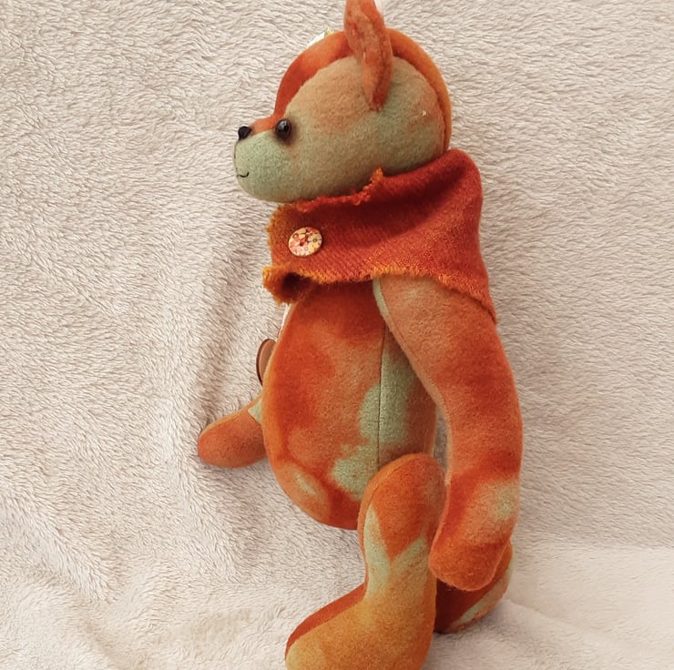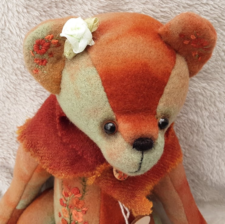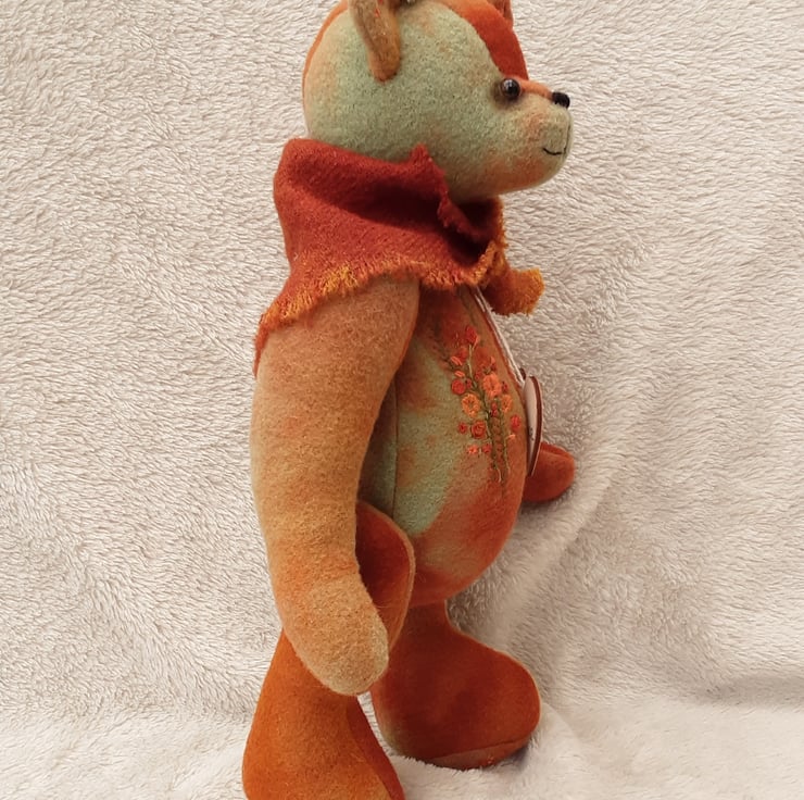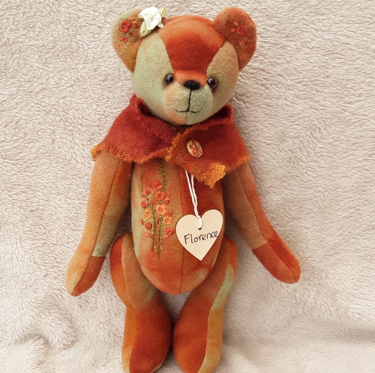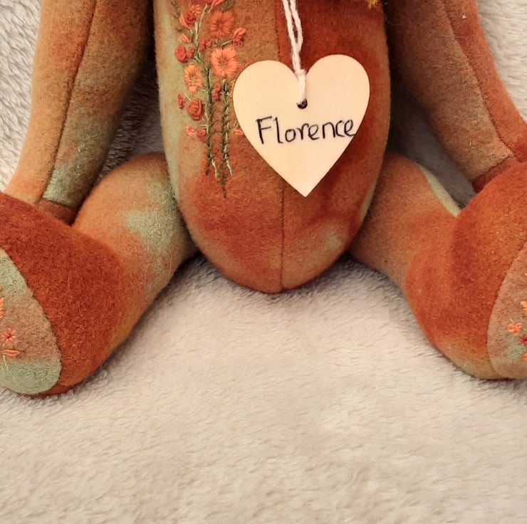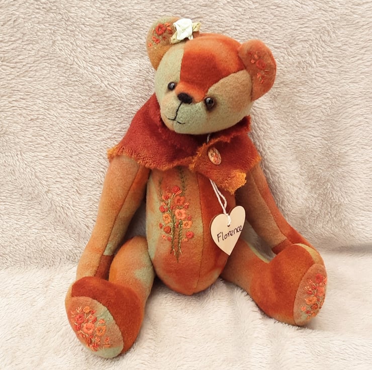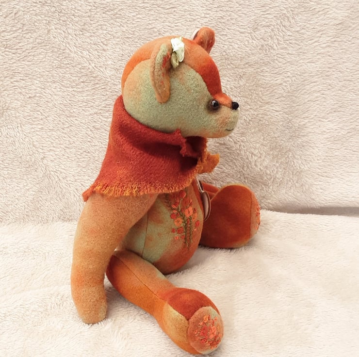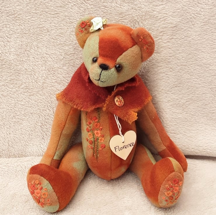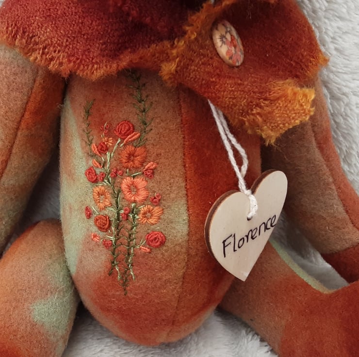 A unique bear, Florence has hand embroidered floral designs to her body, inner ears and foot pads using various orange and green shades to compliment her fabric.