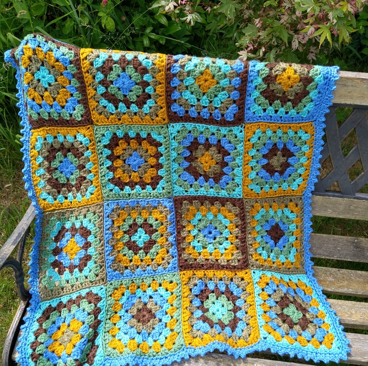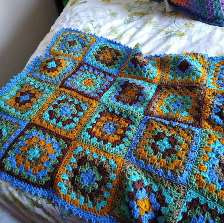 Small crochet acrylic blanket, measures 75 X 60 cms. The warm vibrant colours make this a cosy blanket