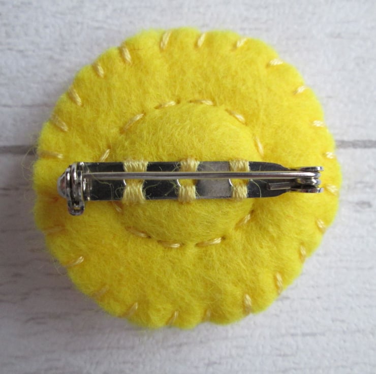 Summer Hat Brooch number three - sunshine yellow wool felt, carefully shaped, then hand embroidered with pink and pale lilac flowers around the crown and finished with a soft green bow. This fun little brooch is fitted with a metal brooch clasp and measures approximately 4.5 cm in diameter. Presented in a drawstring gift bag made from pink and white floral linen.
