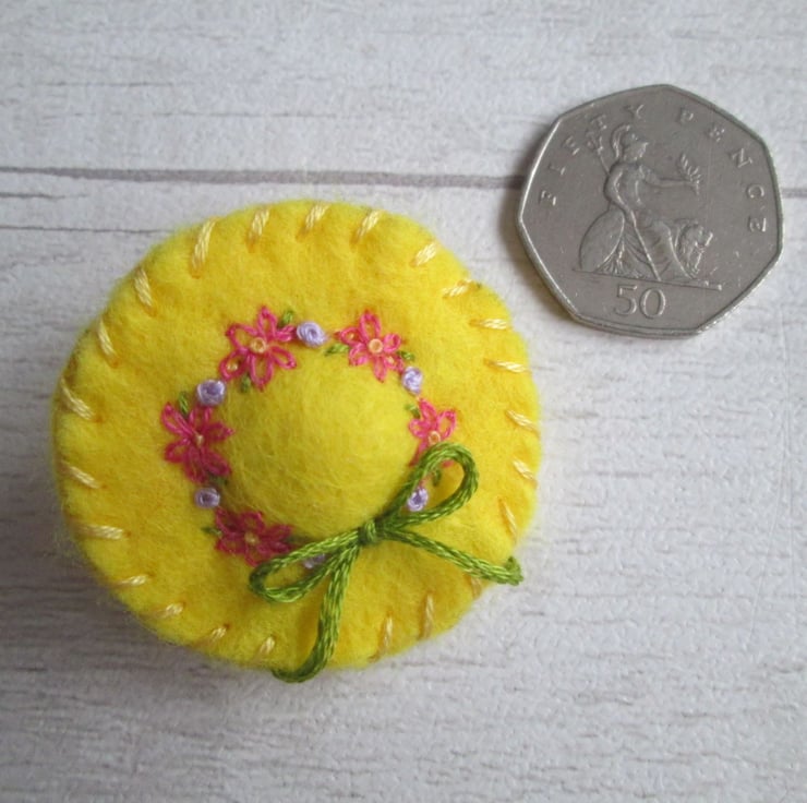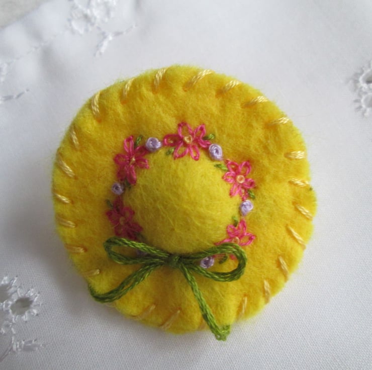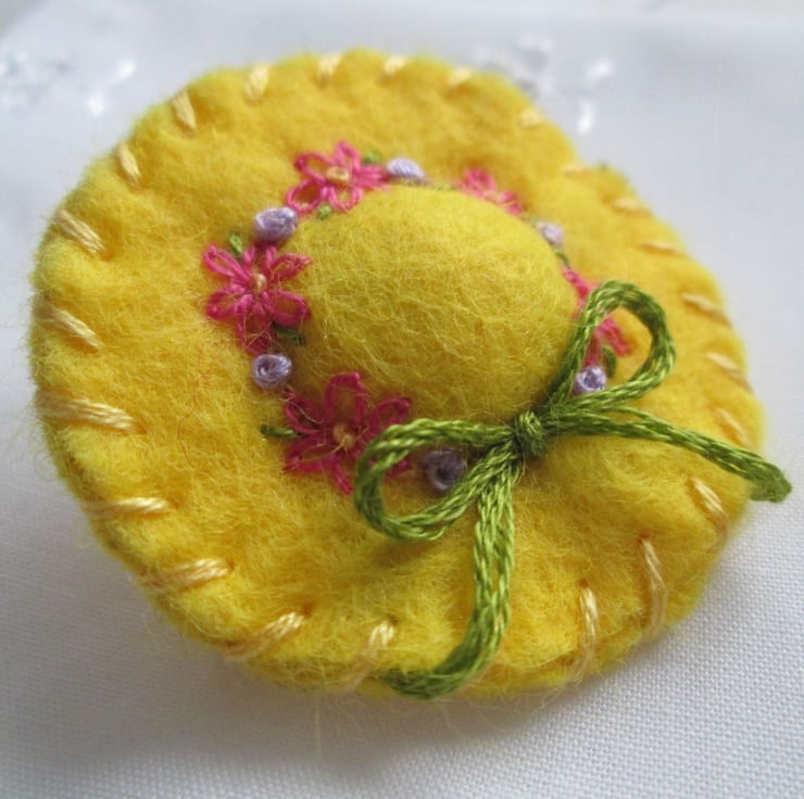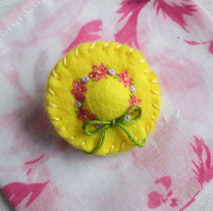 Summer Hat Brooch number three - sunshine yellow wool felt, carefully shaped, then hand embroidered with pink and pale lilac flowers around the crown and finished with a soft green bow. This fun little brooch is fitted with a metal brooch clasp and measures approximately 4.5 cm in diameter. Presented in a drawstring gift bag made from pink and white floral linen.