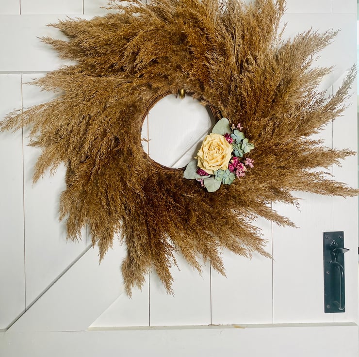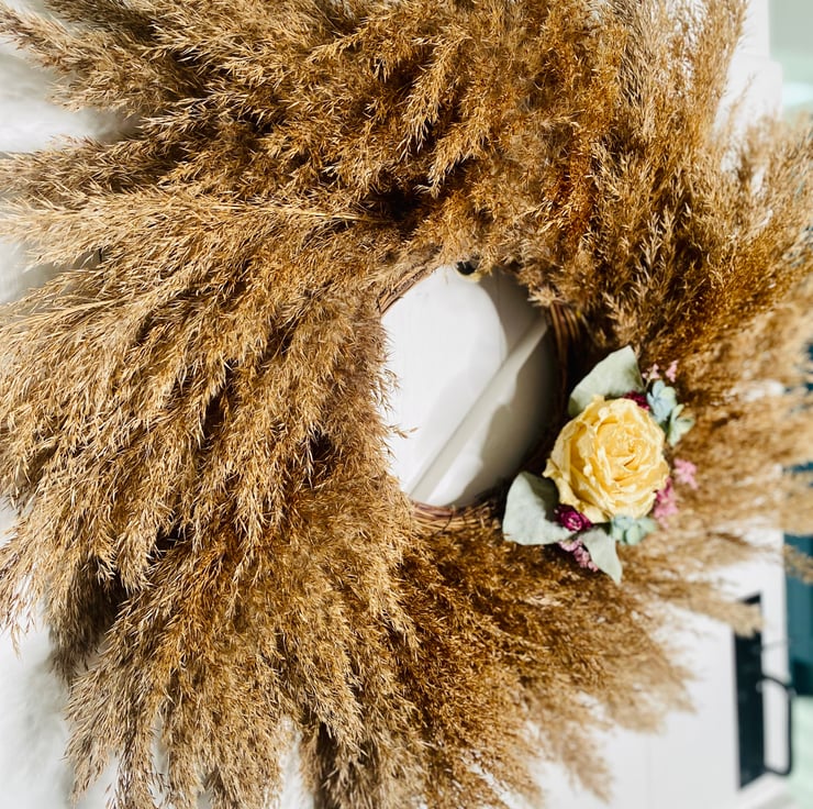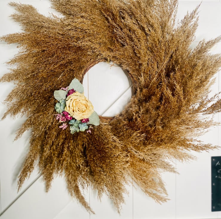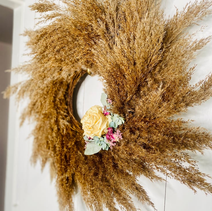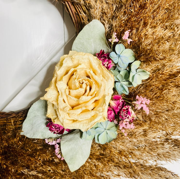 Dried flowers include roses, hydrangeas and eucalyptus. All items are handmade, materials are locally sourced and totally unique. I never make the same design twice.