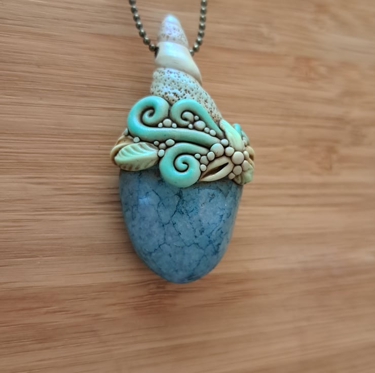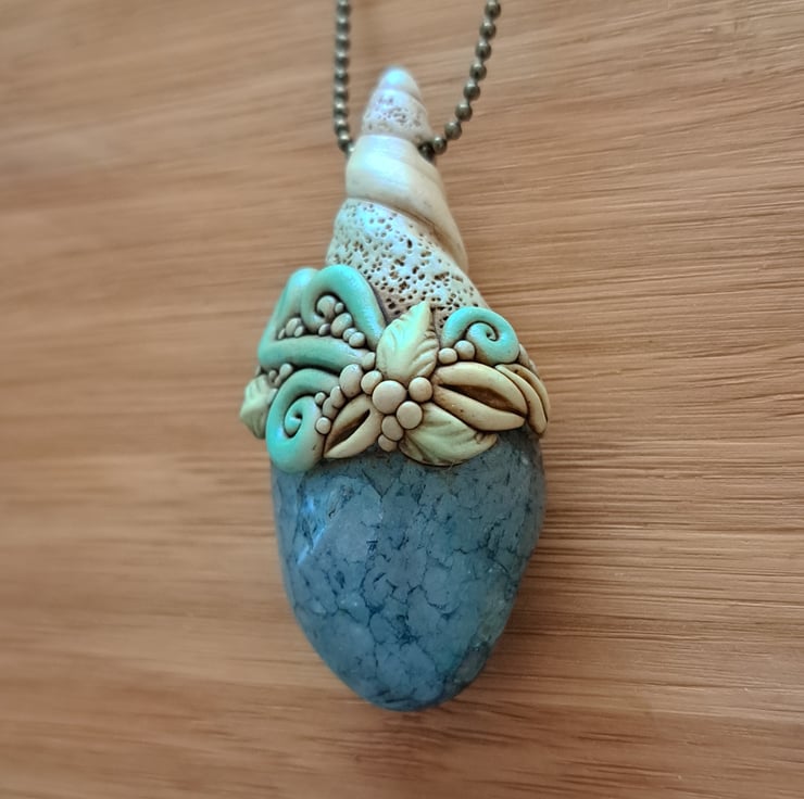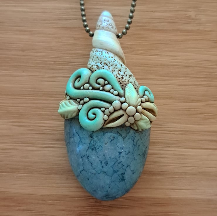 A beautiful amulet lovingly handcrafted from polymer clay and pretty aqua/teal crackle quartz, finished with pastel chalks and a coating of renaissance wax. Complete with ball chain.
