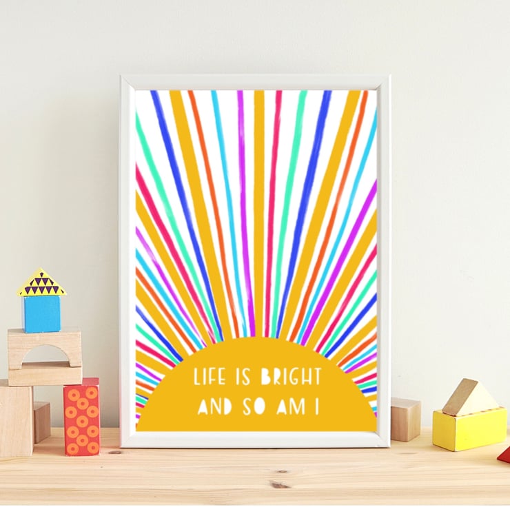 - a half sun with rainbow coloured sun rays with affirmation reading 'Life Is Bright And So Am I' in a fun playful font designed in-house.