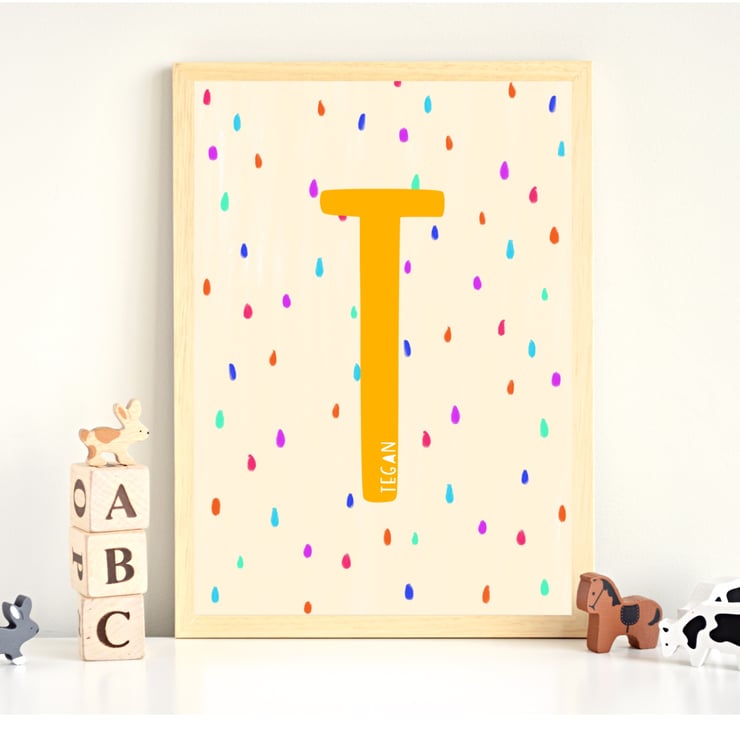 - an orange coloured letter with name added, on a cream/off white background with multi colour rain drops. Font designed in-house