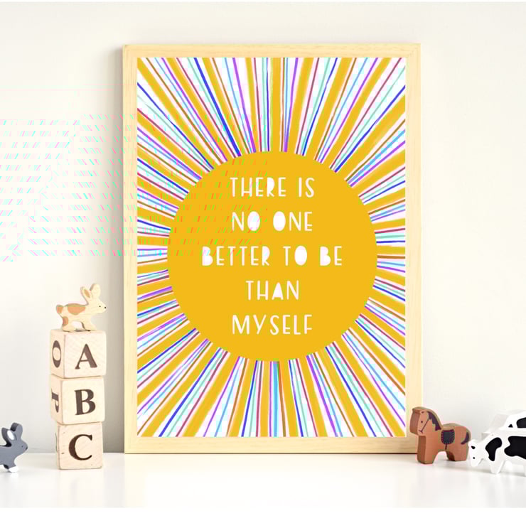 - an orange/yellow coloured sun with multi coloured sun rays with affirmation reading 'There is No One Better To Be Than Myself' in a font designed in-house