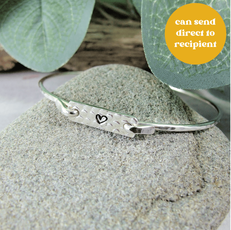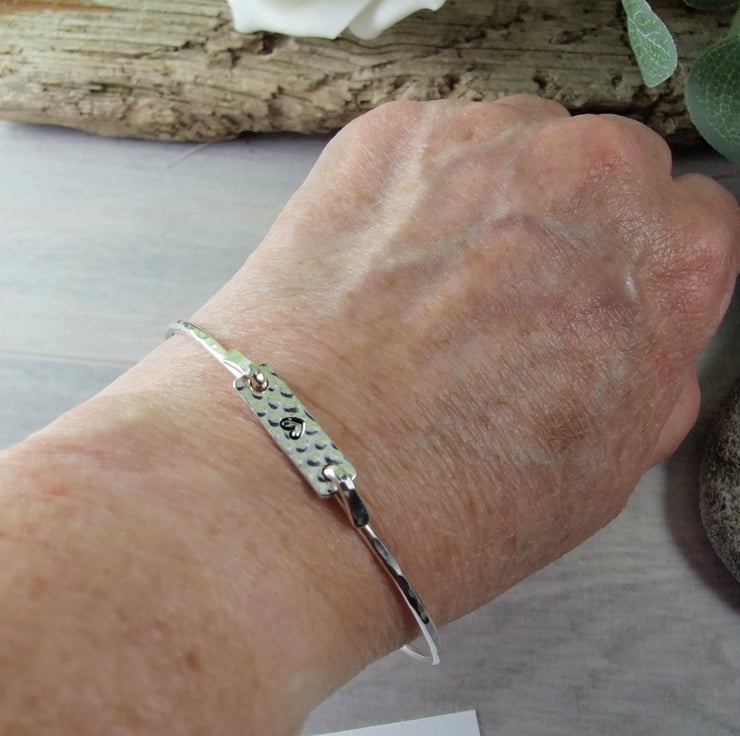 I have made the bangle from 2mm wide recycled sterling siver wire with sterling silver bar at the top. The bar has been given a pattern texture the stamped with a little heart at the centre. The silver bar is fixed securely to the bangle by threading the wire through a hole and flattening the ends slightly before bending over. (nb the bangle is a fixed size and does not open and close)