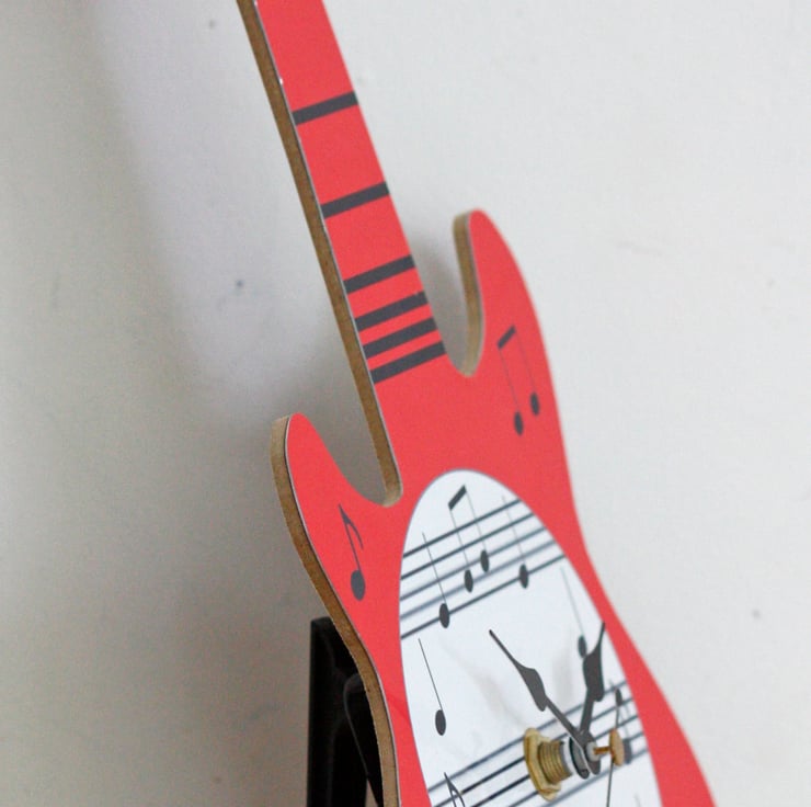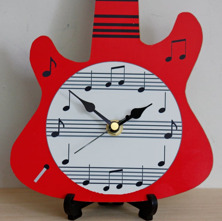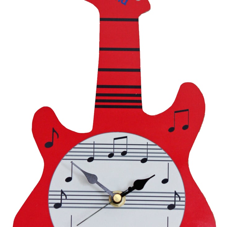 This clock is in the shape of a Guitar and is approx 16.7cm wide and 28.3cm high. It can be hung on the wall using the hanger on the clock mechanism or used as a Mantle clock by using the stand that is provided. It is personalised by adding the Name on the neck of the guitar.
