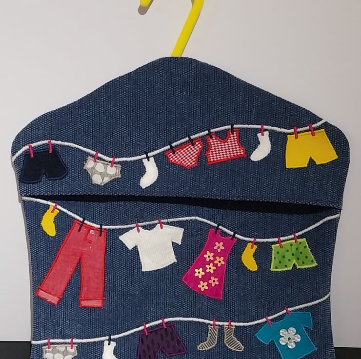It has three zig-zag stitch washing lines, with colourful zig-zag pegs, featuring textural washing including, socks, pants, t-shirts, jeans, and dresses. Two of the items have also been embellished with flower sequins and beads to give an extra sparkle.
