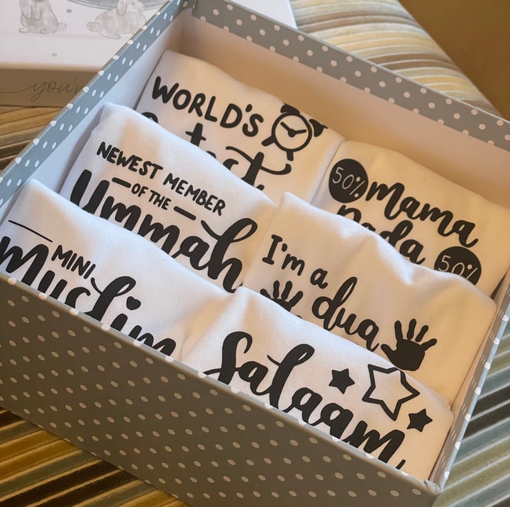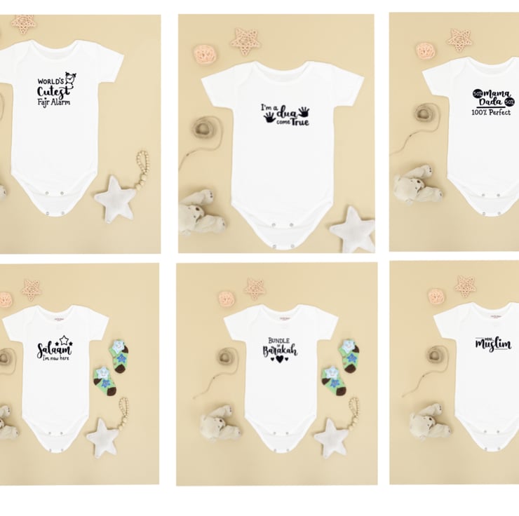An adorable, handmade collection of bodysuits to announce the arrival of your precious little bundle. The perfect gift for newborns, baby showers, Eid and more.