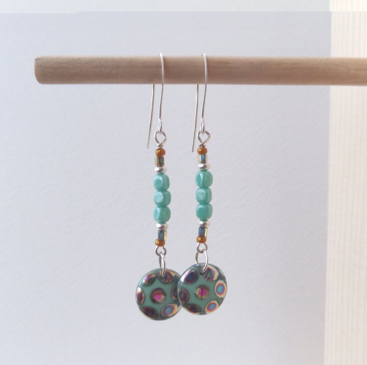 Lovely patterned coin beads and mint cubes on this unusual pair of silver plated earrings.