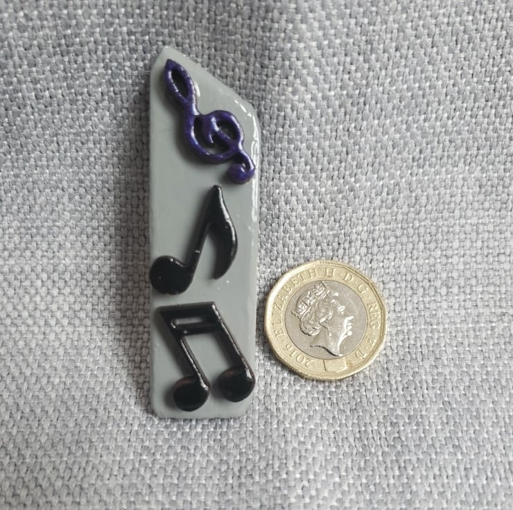 These brooches are all colourful and individual. This one has two black notes and a purple treble clef on a grey background. Perfect for musicians and music lovers.