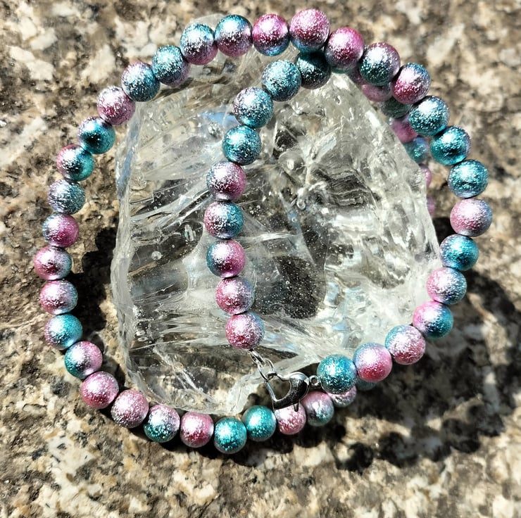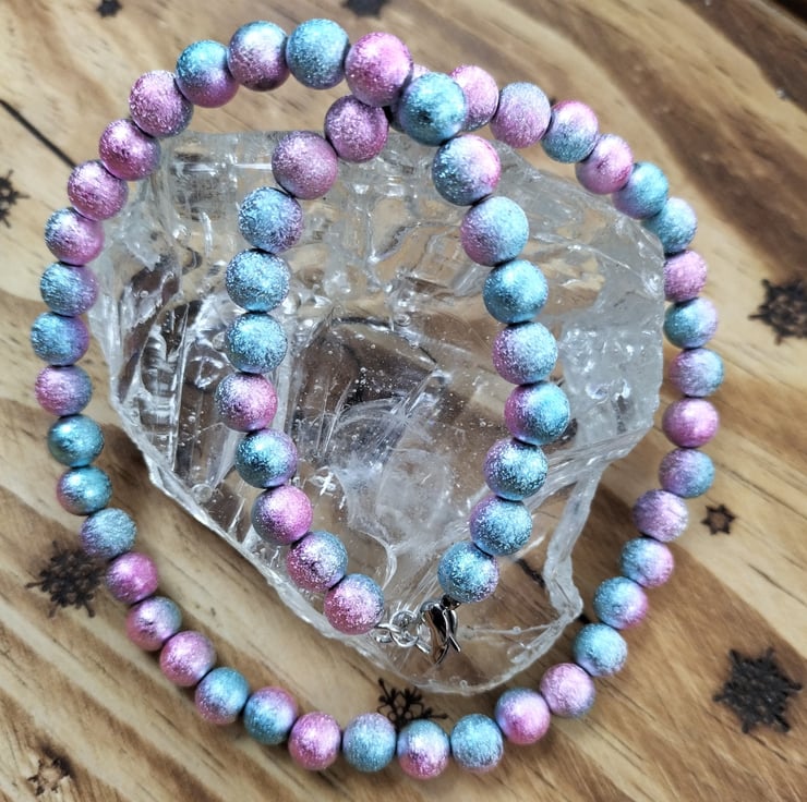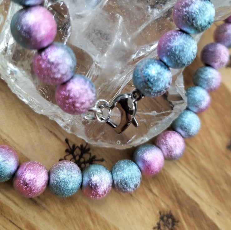This necklace is 18" of pure magic with 8mm stardust miracle beads with a heart shape clasp.