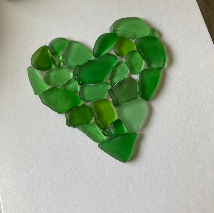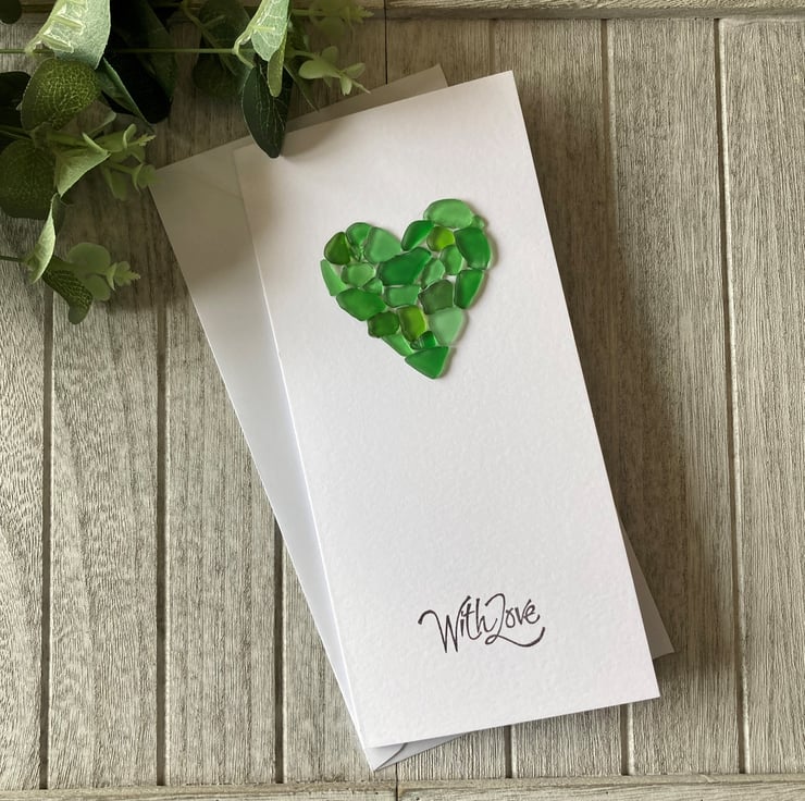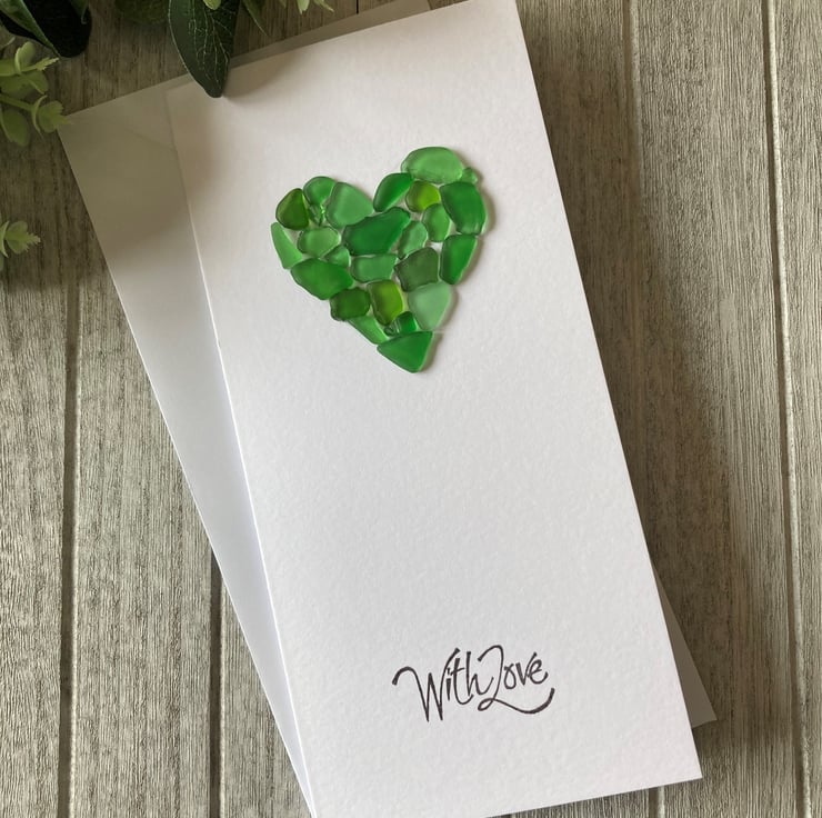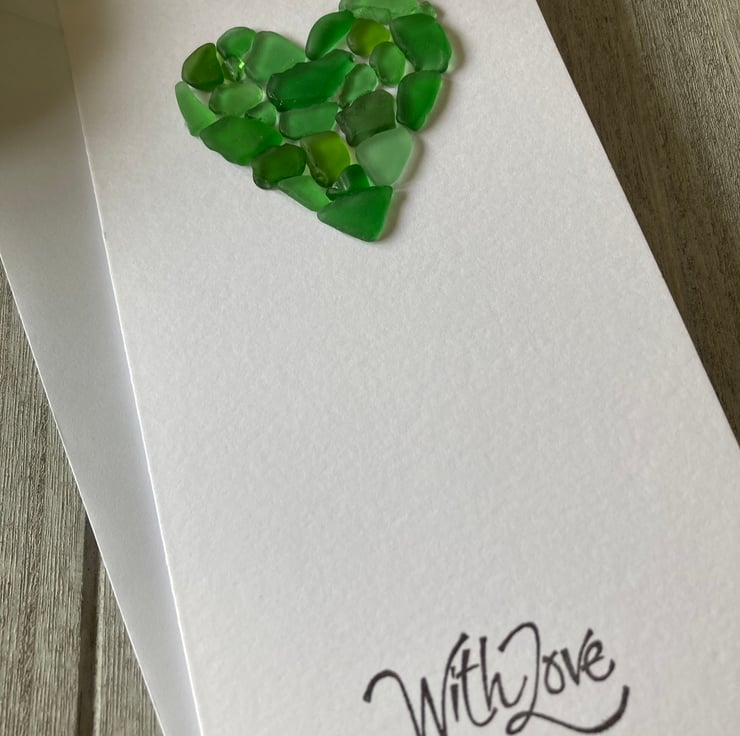 Handmade Birthday card on premium white cardstock featuring a sea glass heart using different shades of green sea glass and finished with a hand stamped greeting in black ink "With Love".
