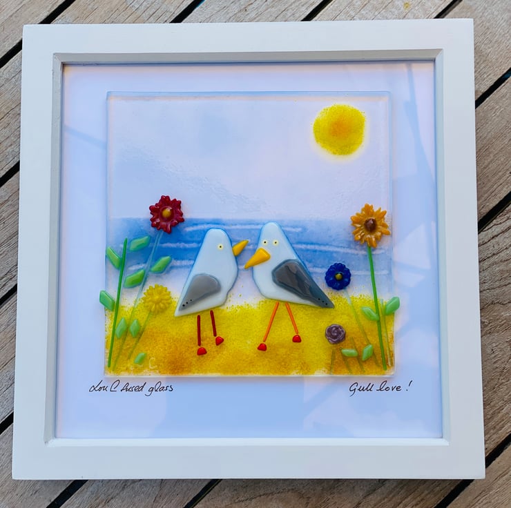 From my new coastal range of course there had to be fused glass gulls . Seagulls are such a common sight around my home in Devon I love to study them and include in my glass art . Each of my pictures are unique. Frame size 21.5 cm square ready to hang .