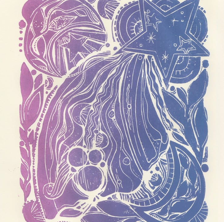 A4 in size, this handprinted linocut shows an abstract shooting star motif with celestial and leafy details!