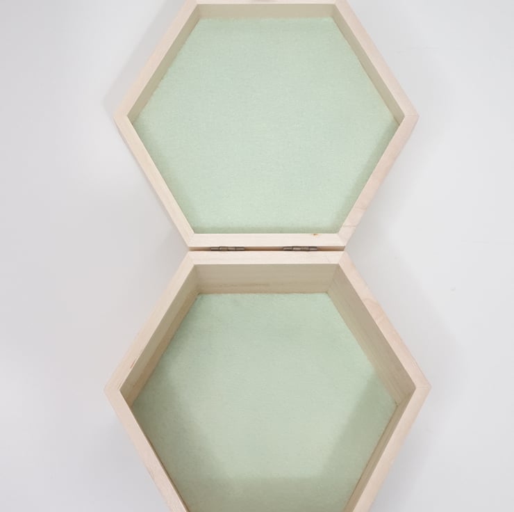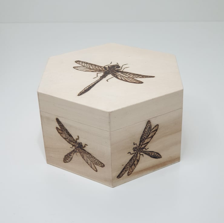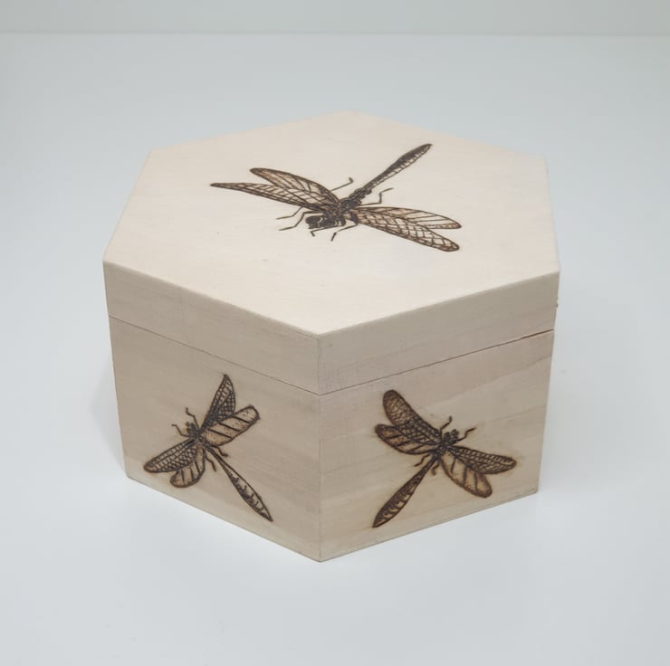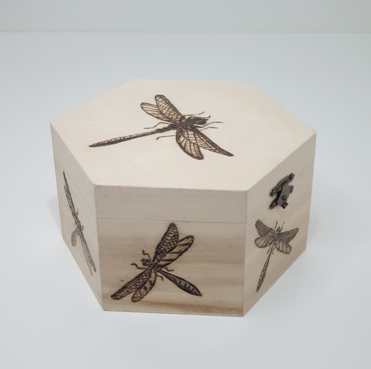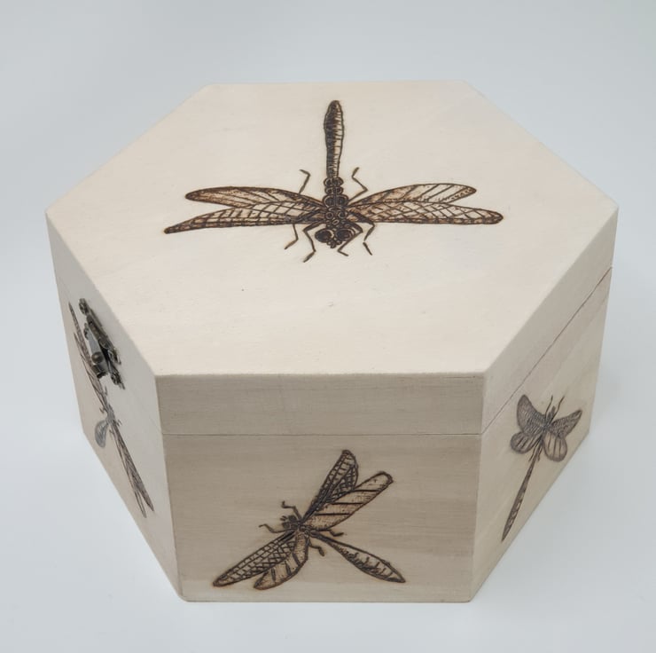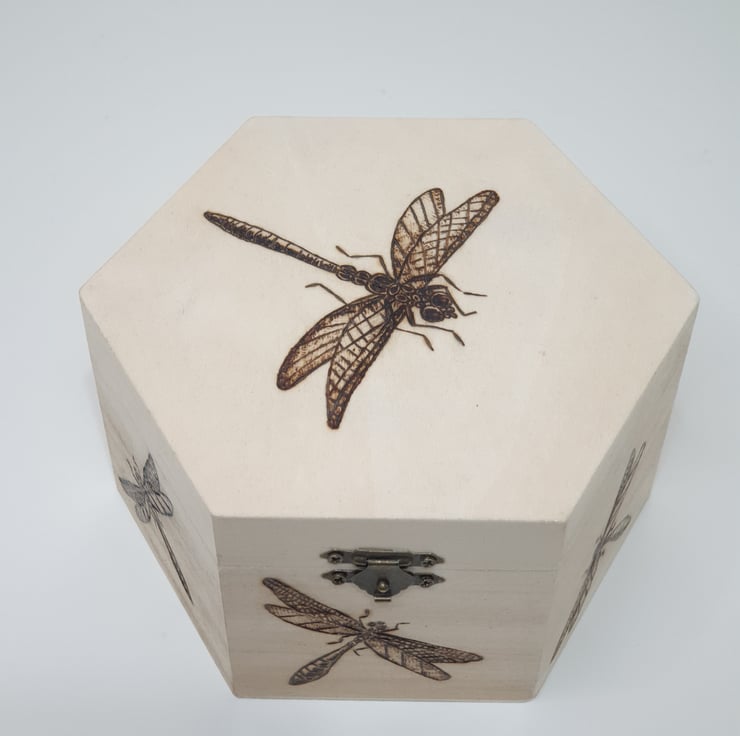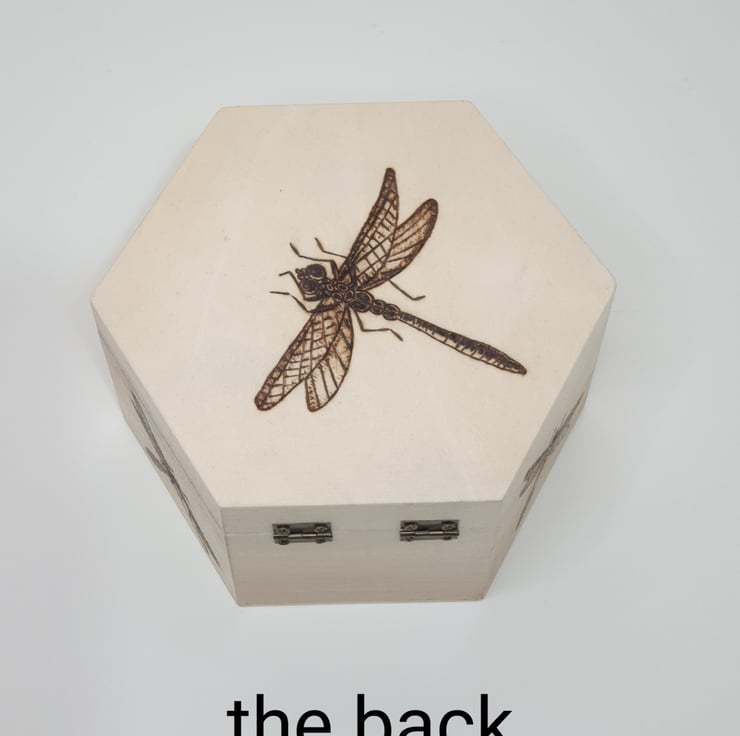 Lovely wooden hexagonal box with metal clasp which has been handburnt with decorative dragonflies on the lid and 5 sides. The box has been finished with several coats of satin varnish and the interior has been part lined with pastel green felt.