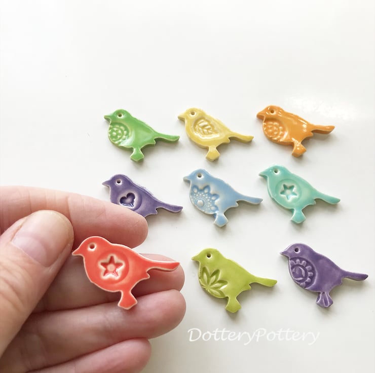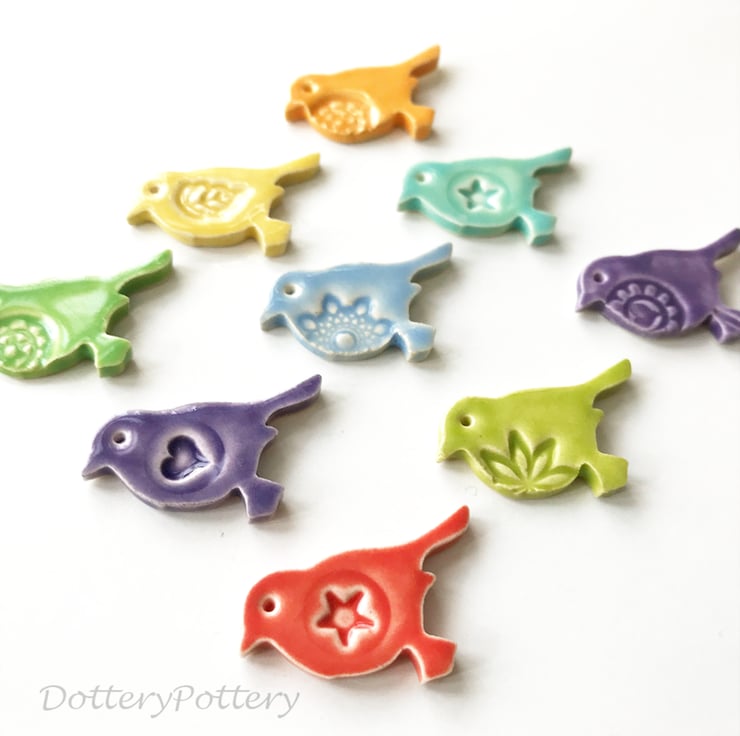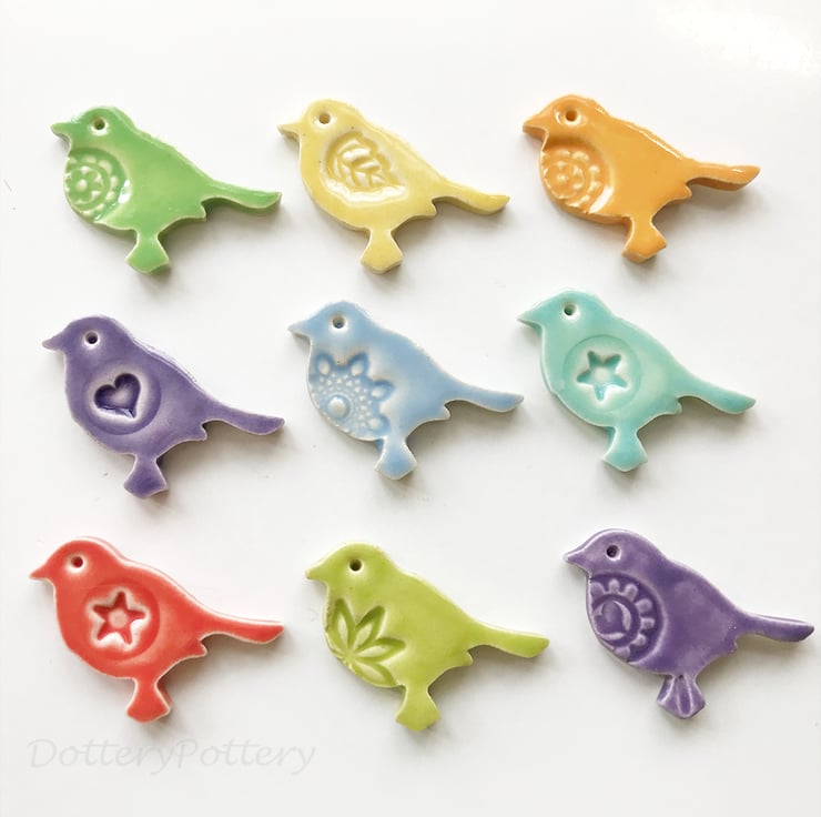 This little set of teeny bird tiles are made from white earthenware clay and twice fired to a top temperature of 1100 degrees, so they are nice and strong. They are glazed on the front only. They measure 3cm long x 2cm wide x 0.4cm deep. Perfect for all sorts of arts and crafts projects.