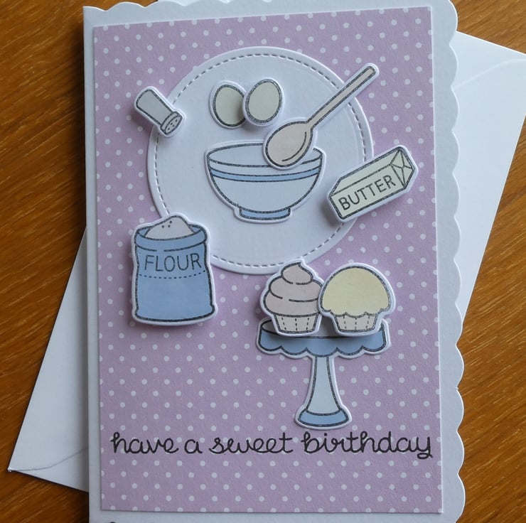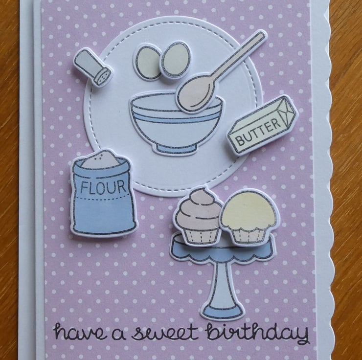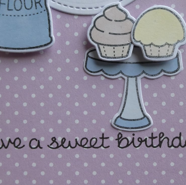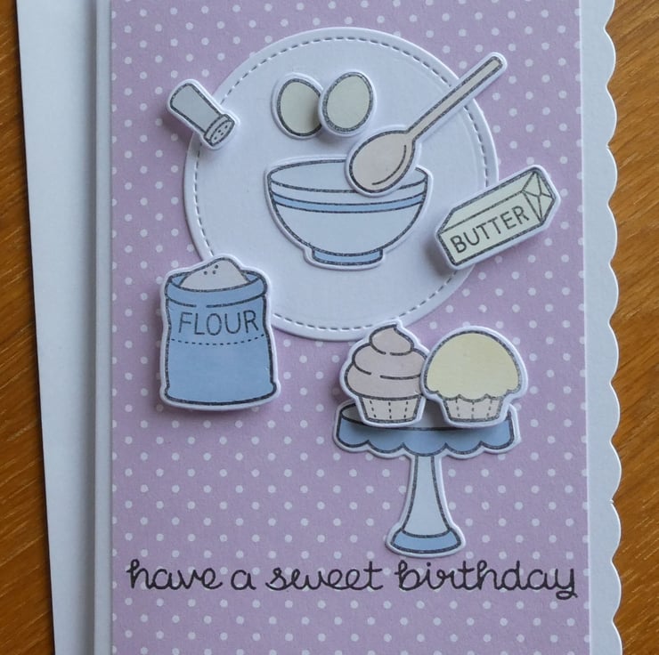 The design shows an open bag of flour, a flour shaker, eggs and butter next to a pastel blue bowl and wooden spoon, with chocolate and lemon fairy cakes on a blue cake stand. All of the images have been individually hand stamped, die cut and coloured. The hand stamped greeting 'have a sweet birthday' in black archival ink completes the design.