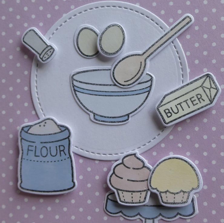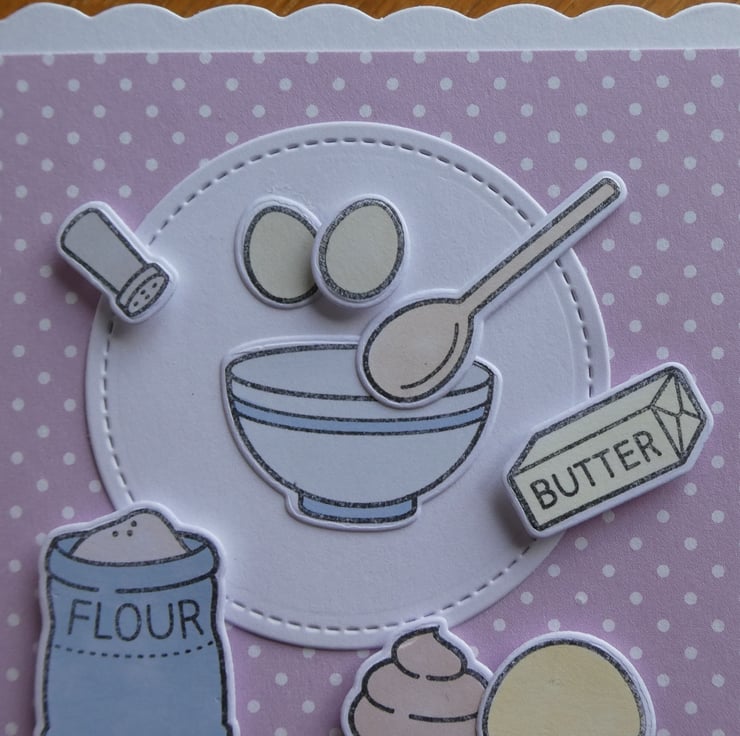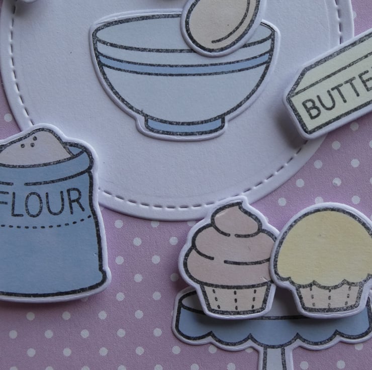 A base of pale pink and white polka dot card has been topped with a die cut circle of white card, with a stitched effect edging. Several hand coloured baking accessories have then been attached, some raised on foam pads to add dimension.