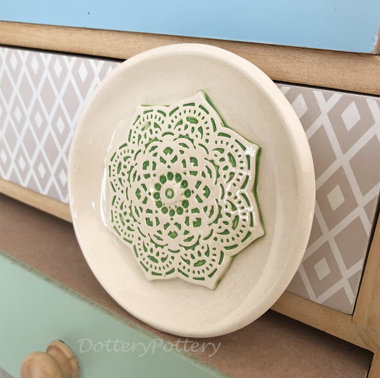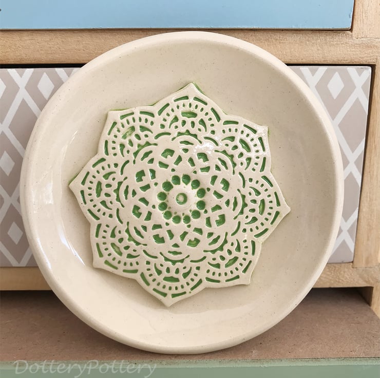 This little dish is made from white earthenware clay and finished with a bold lace motif to the centre which is slightly raised. It has been fired in an electric kiln and finished with a food safe glaze. Perfect as a trinket dish. It measures 9cm diameter x 1.5cm deep.
