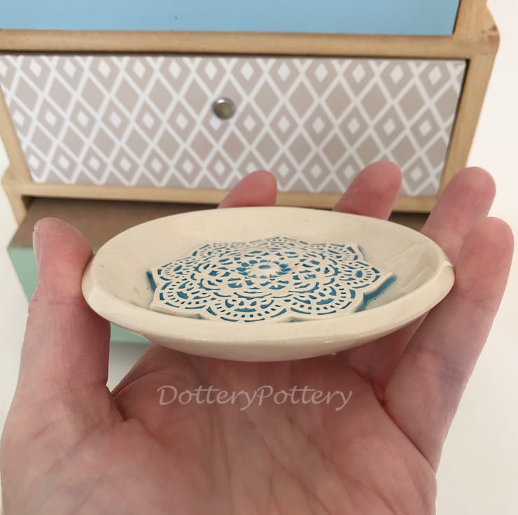 This little dish is made from white earthenware clay and finished with a bold lace motif to the centre which is slightly raised. It has been fired in an electric kiln and finished with a food safe glaze. Perfect as a trinket dish. It measures 9cm diameter x 1.5cm deep.
