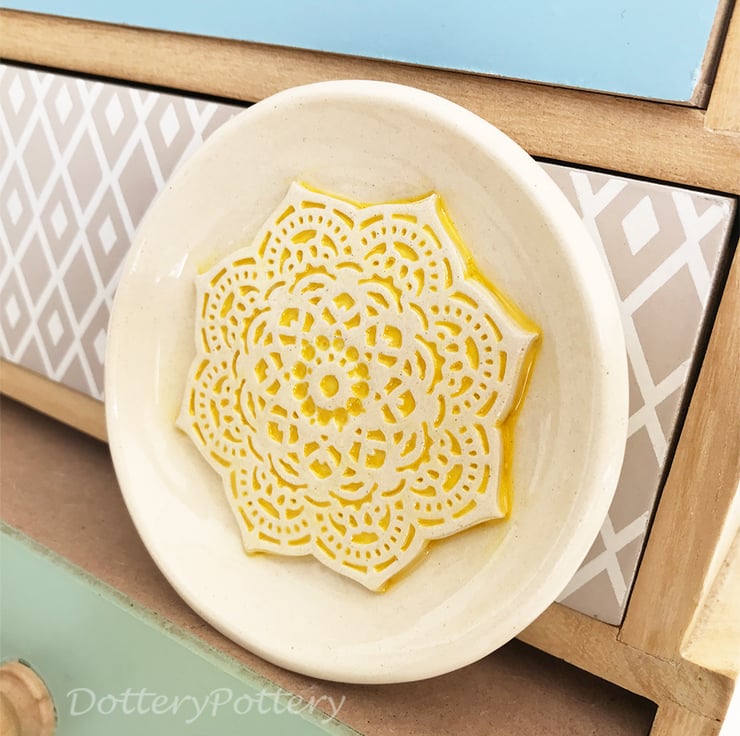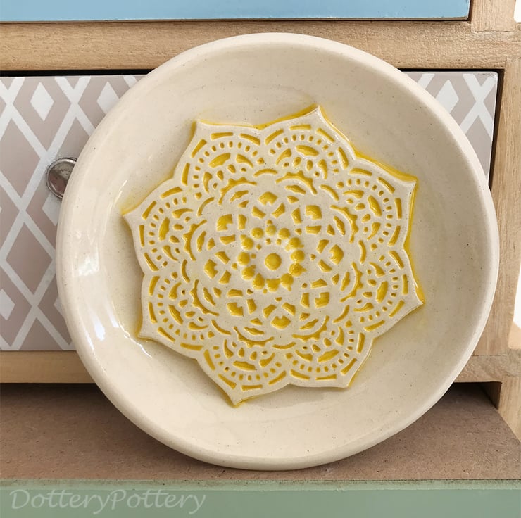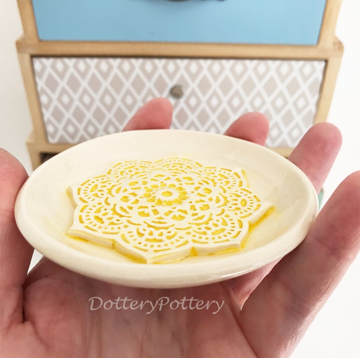 This little dish is made from white earthenware clay and finished with a bold lace motif to the centre which is slightly raised. It has been fired in an electric kiln and finished with a food safe glaze. Perfect as a trinket dish. It measures 9cm diameter x 1.5cm deep.