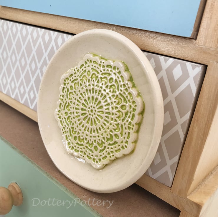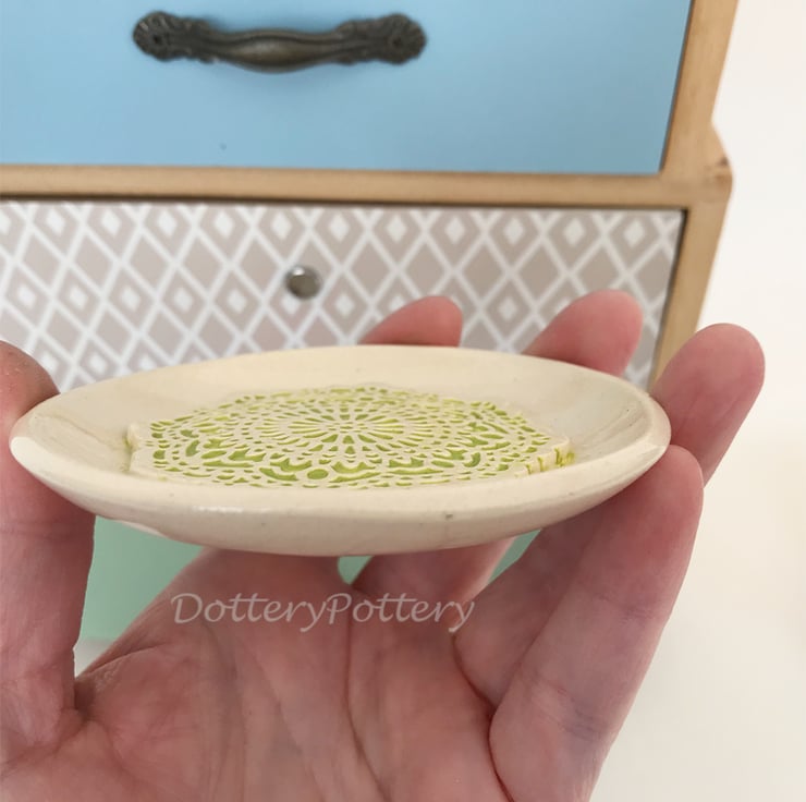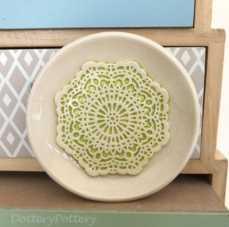 This little dish is made from white earthenware clay and finished with a bold lace motif to the centre which is slightly raised. It has been fired in an electric kiln and finished with a food safe glaze. Perfect as a trinket dish. It measures 9cm diameter x 1.5cm deep.