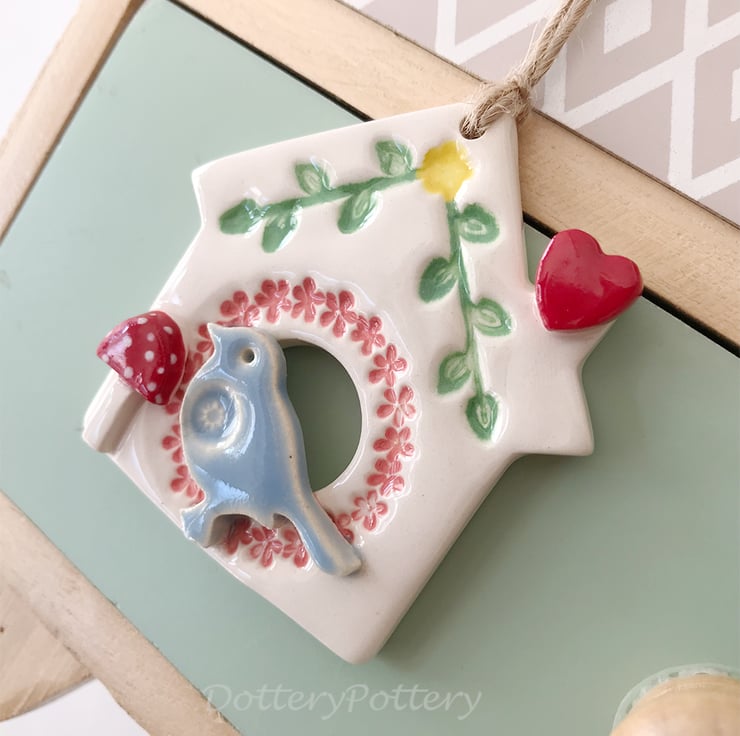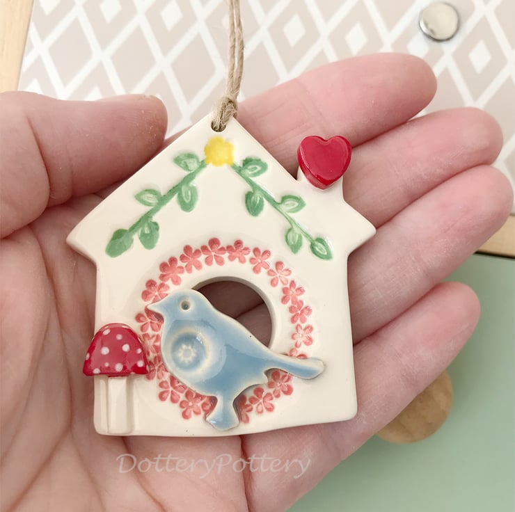 This little bird house decoration is made from white earthenware clay and finshed with a little pottery bird. It has been fired twice and finished with a glossy glaze for a lovely smooth finish. It measures 7.5 x 7cm and hangs from rustic brown string
