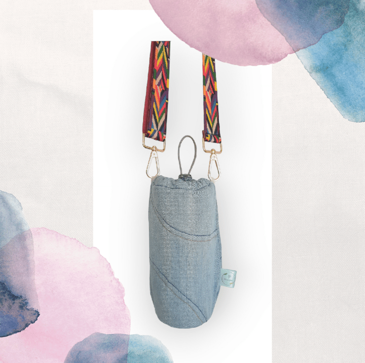 This mixed blue denim water cooler is pale blue in the main part with a darker denim pocket. It has twin needle top stitching over all sides and elasticated drawstring top opening to keep the cold in. The colourful strap is detachable and adjustable.