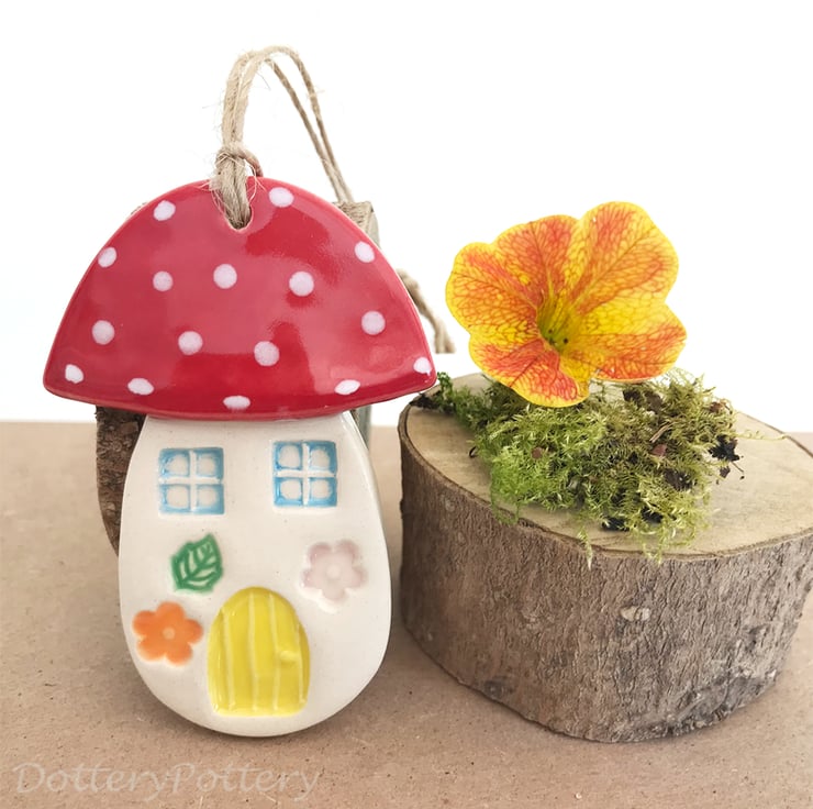 This little toadstool house decoration is made from white earthenware clay and finished with bold pattern and colour. It has been fired twice and finished with a glossy glaze for a lovely smooth finish. It measures 7cm x 5cm and hangs from rustic brown string