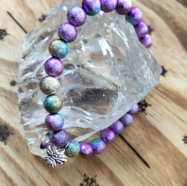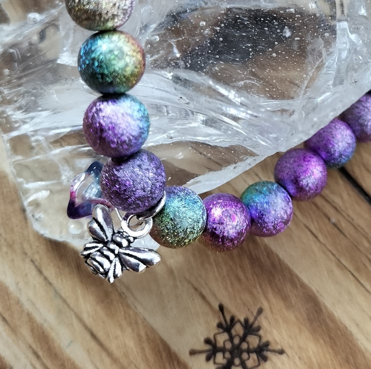 This bracelet is 7.5" pure magic with 8mm rainbow miracle beads and a cute silver tone bee.