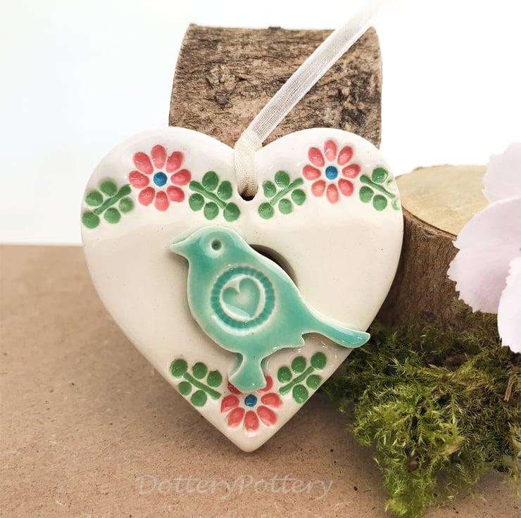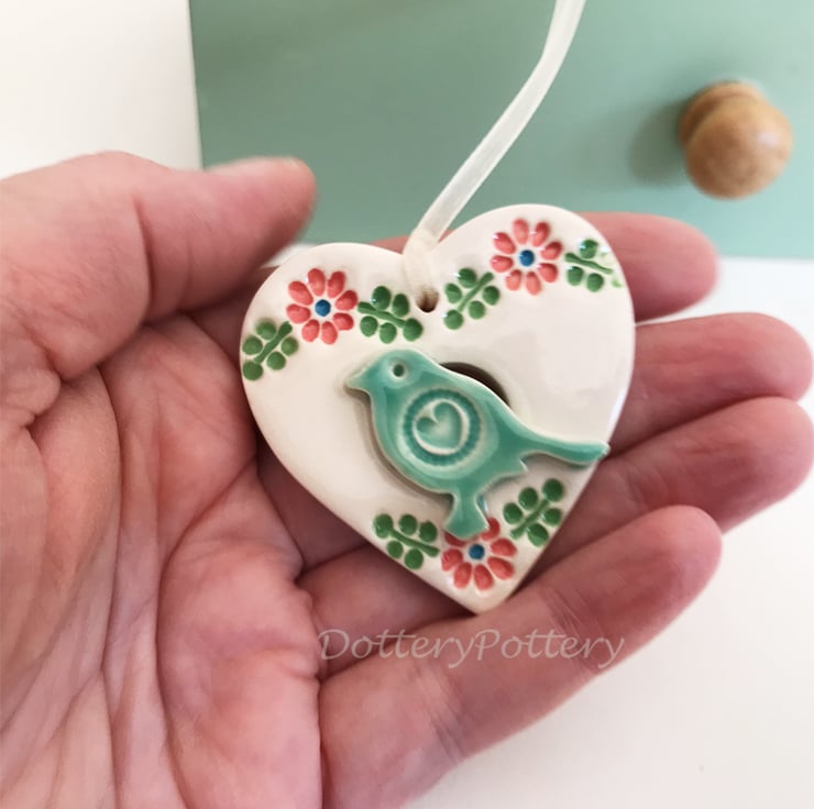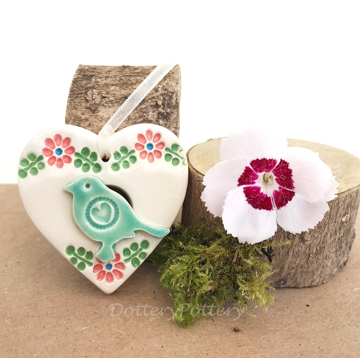 This little heart decoration is made from white earthenware clay and finshed with a little pottery bird. It has been fired twice and finished with a glossy glaze for a lovely smooth finish. It measures 4.5 x 5cm x 1cm deep and hangs from an organza ribbon