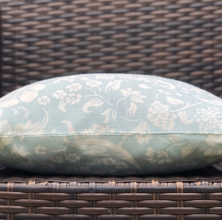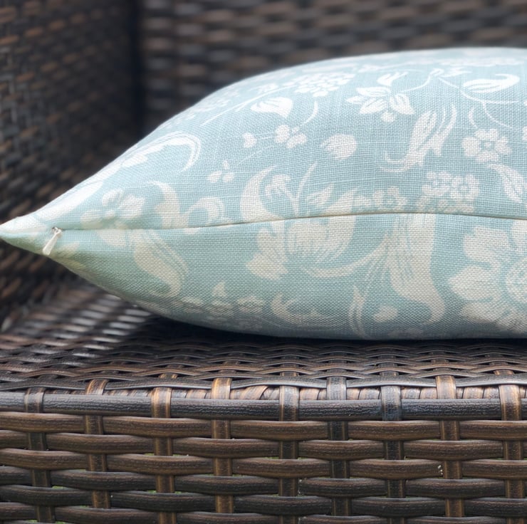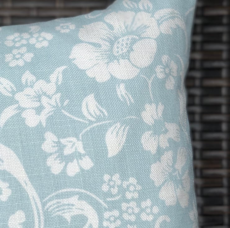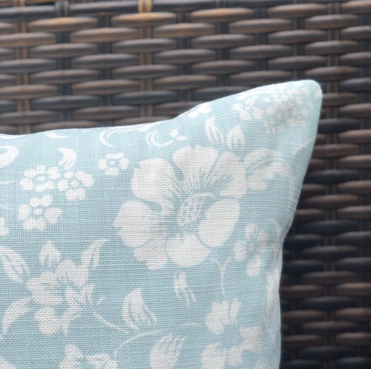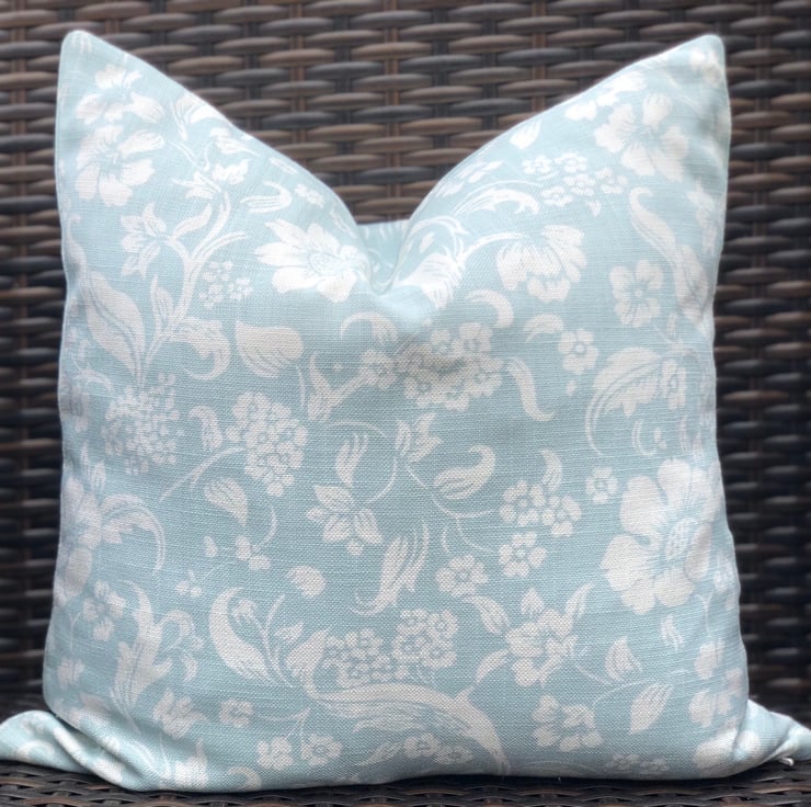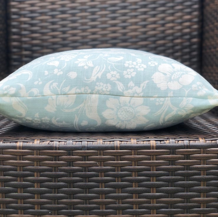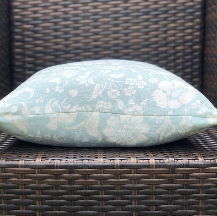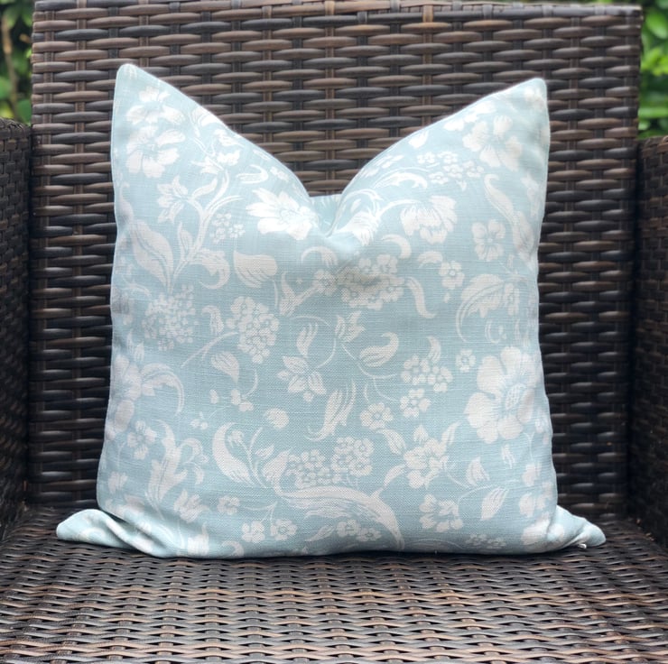 A duck egg floral cushion cover, made with a beautiful linen look, 100% cotton Laura Ashley fabric.
