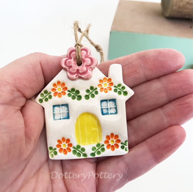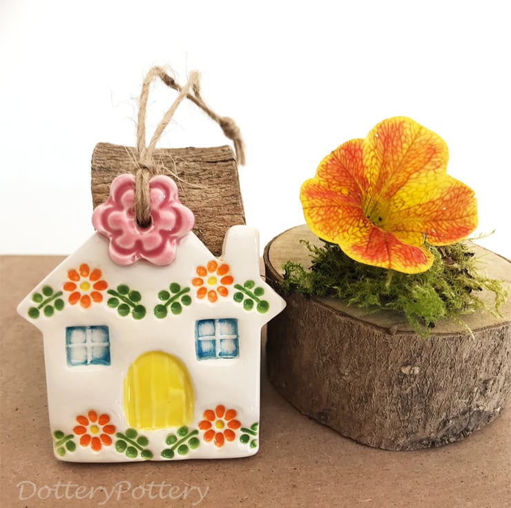 This little house decoration is made from white earthenware clay. It has been fired twice and finished with a glossy glaze for a lovely smooth finish. It measures 7.5 x 7cm and hangs from rustic brown string