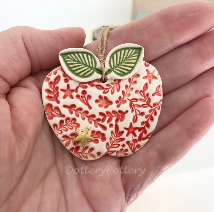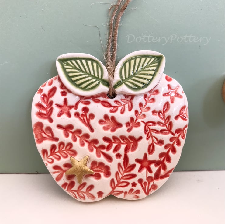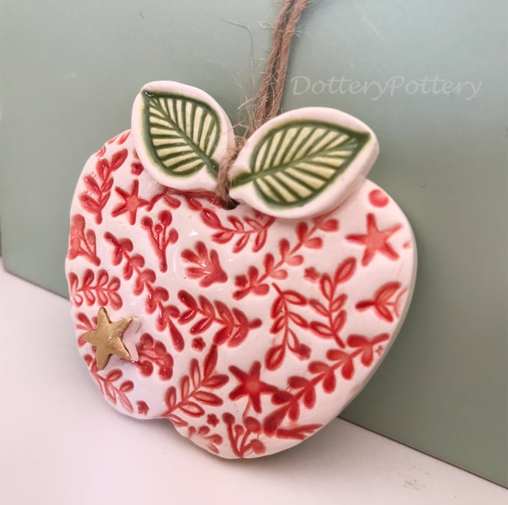 This little ceramic apple has been made from white earthenware clay, It has been imprinted with pattern, and finished with a gold star. It has been fired twice in an electric kiln and finished with a clear, glossy glaze. It hangs on a rustic brown string and measures 5cm x 5cm.