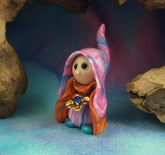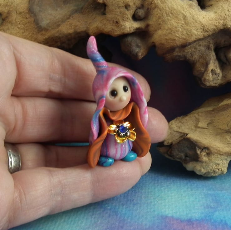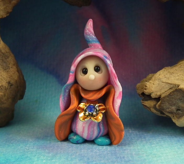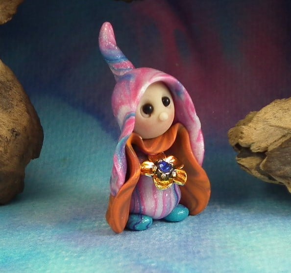 This is a 'one of a kind' creation having been entirely handmade without the use of moulds here at my studio on the Sussex Coast. Modelled with artist blend polymers, blushed before sealing with lacquer, Lunar has sparkling black onyx eyes and variegated robes. Lunar the Floral Gnome is just one and a half inches tall.