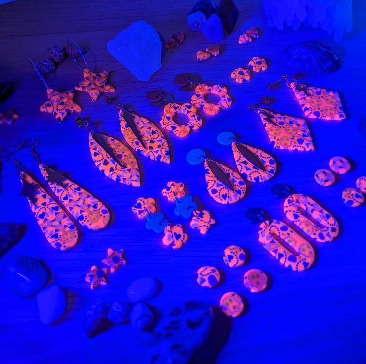 These earrings are made from neon pink clay, packed with 90's inspired design elements. The earrings are coated with a layer of resin to protect them. The studs are mounted on stainless steel posts with scroll back fasteners.