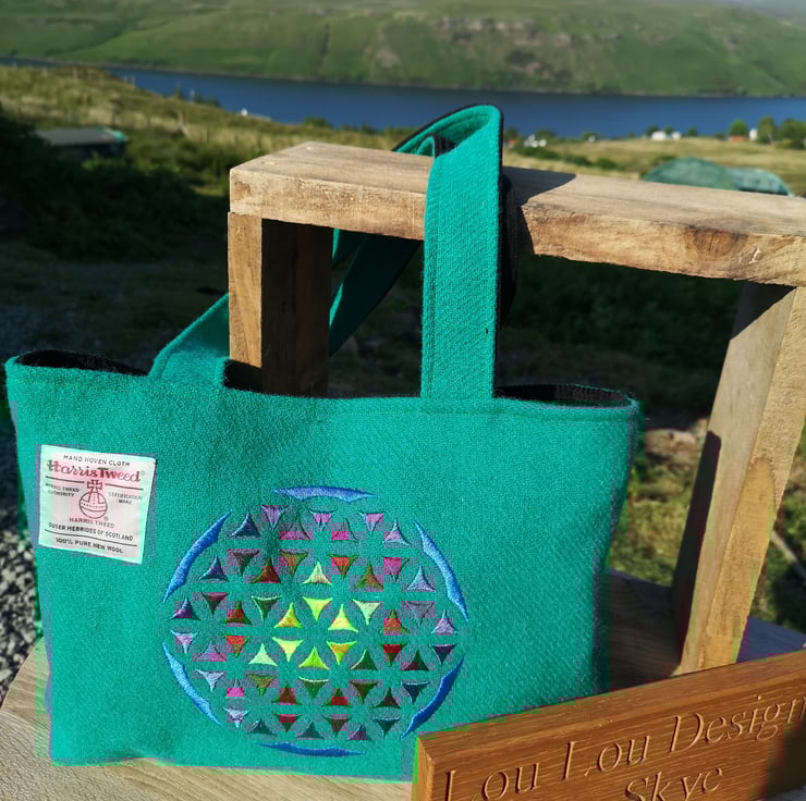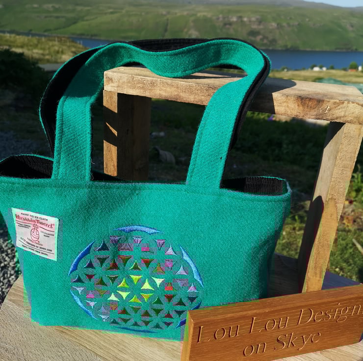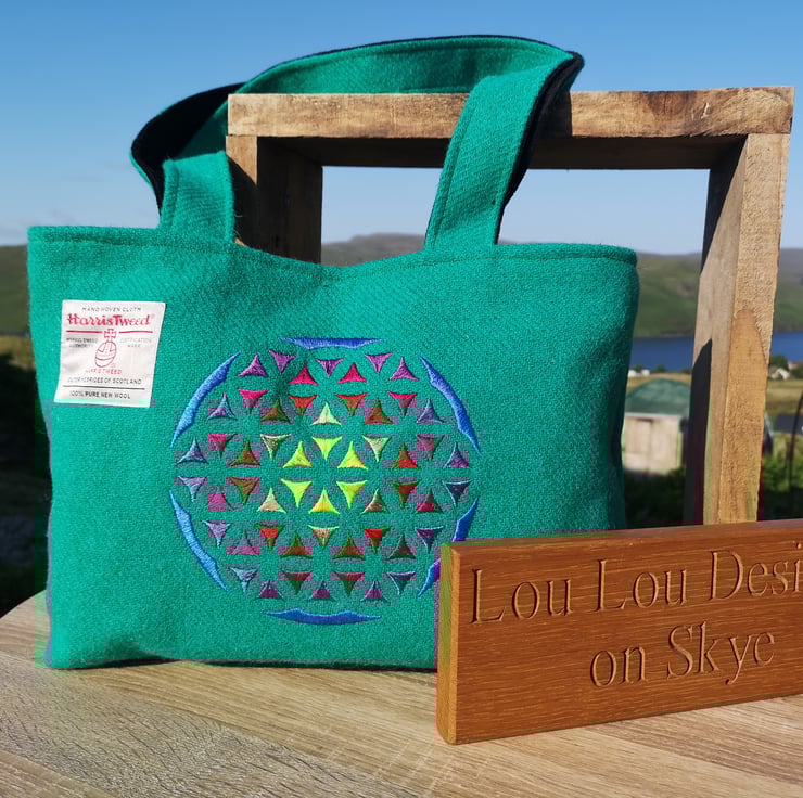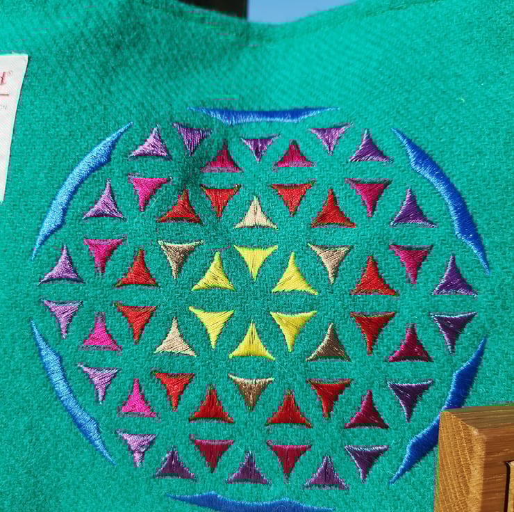 This particular bag has a gorgeous embroidered flower of life. Which is sacred geometry.