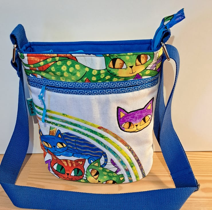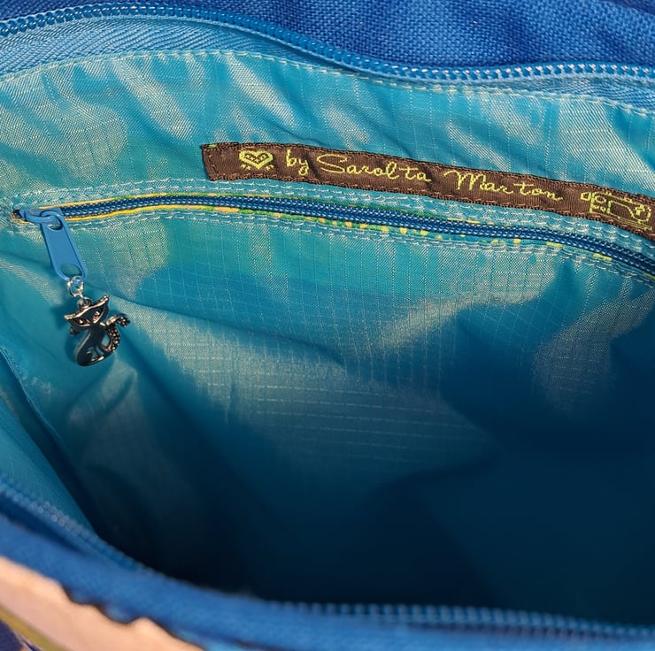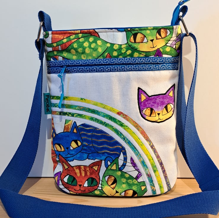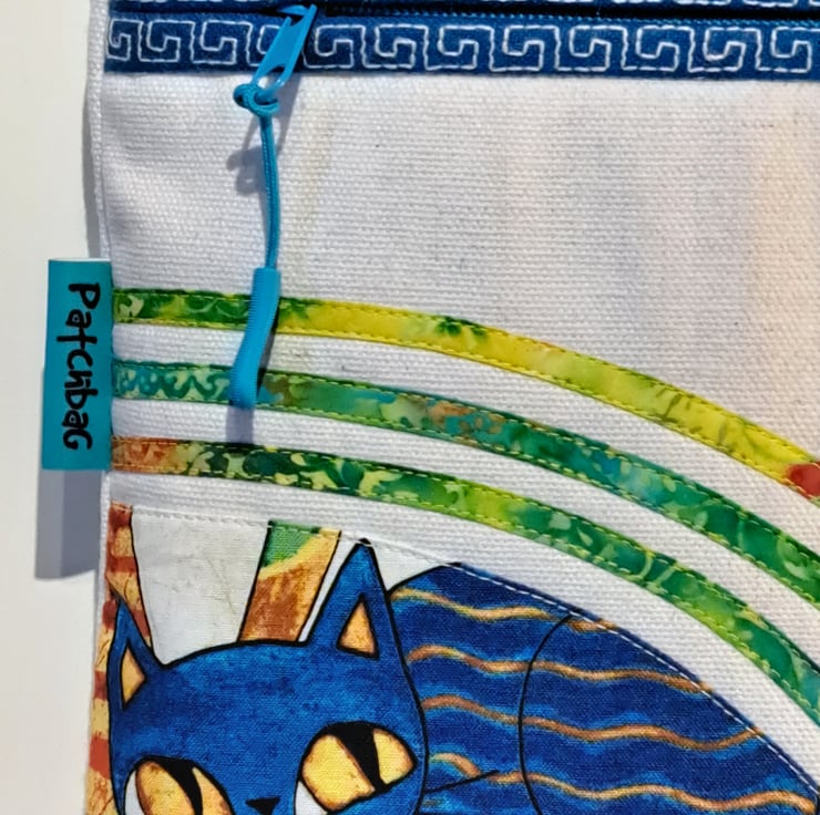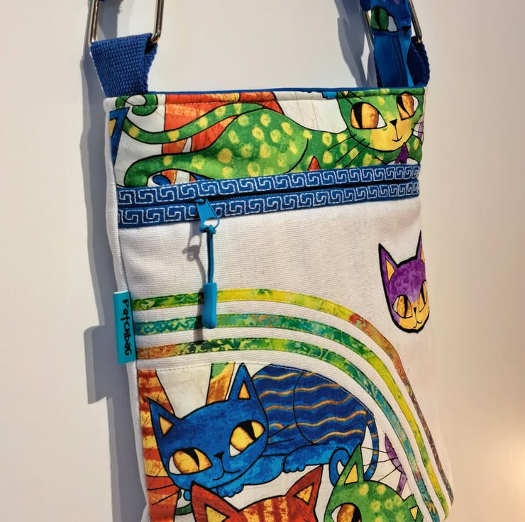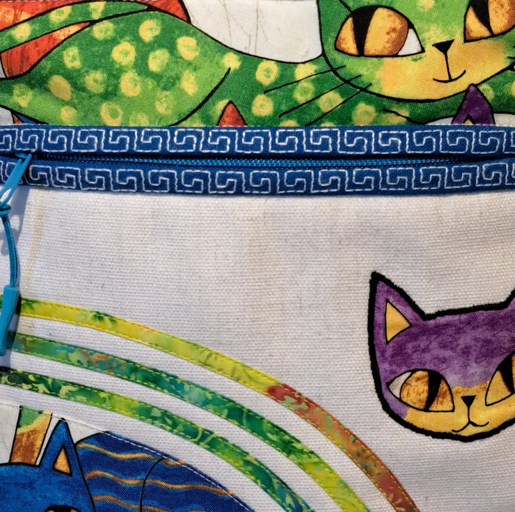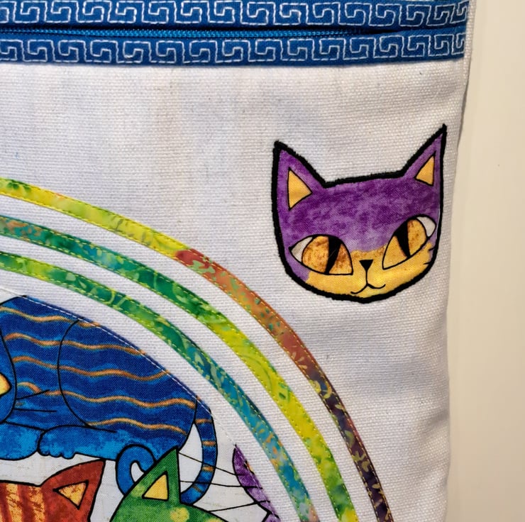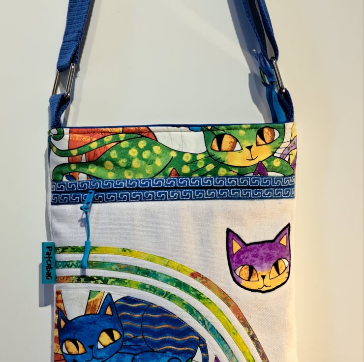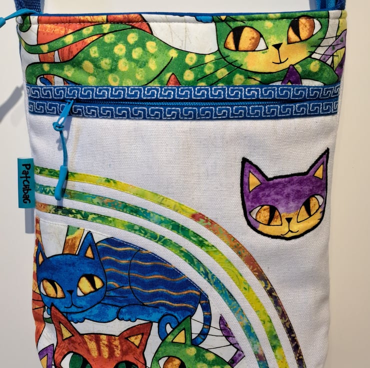 Unique natural white canvas handbag with colorful cats pattern. The bag made with patchwork, applique and quilting techniques. The main fabrics are cotton canvas and cotton fabrics, the lining made from waterproof fabric. The shoulder bag has outside pocket and inside pocket, both closing with zip. The front of the bag decorated applique cat face and around the zip has mashine embroidery greek key pattern features. The inside zip decorated with cat charm. The shoulder strap is adjustable with silver metal clasps. Can use as a shoulder bag or as a crossbody bag. The dimensions of the bag: hight 27cm, width 24 cm,depth on the bottom of the bag 7cm.