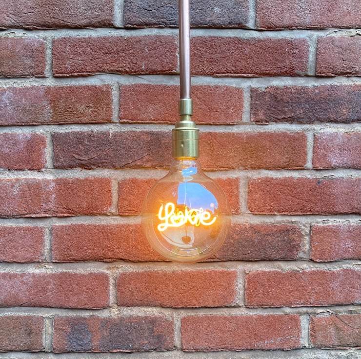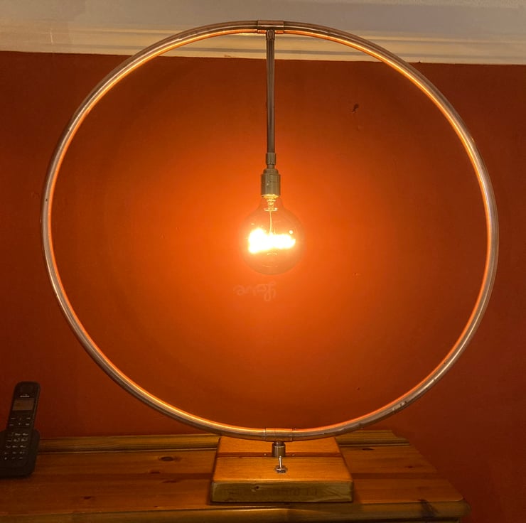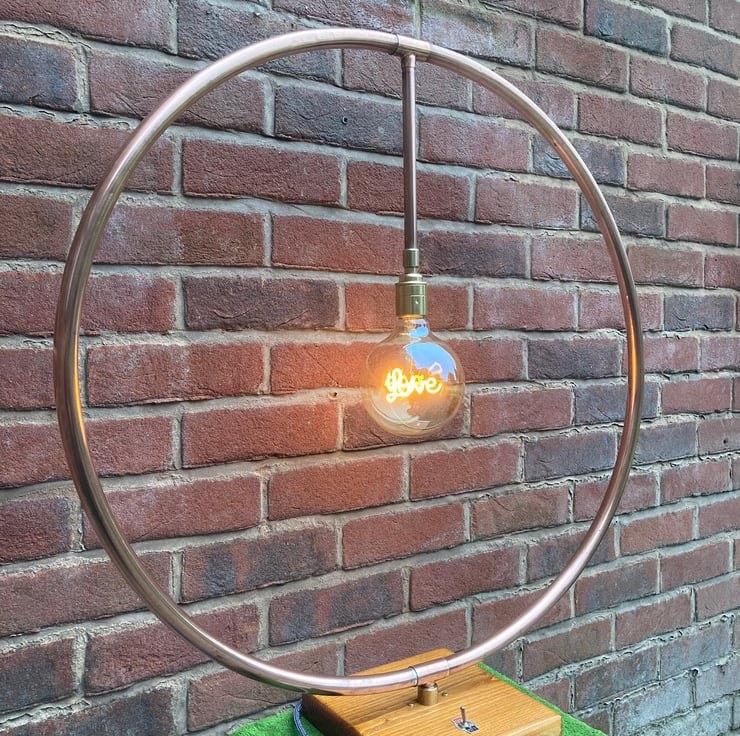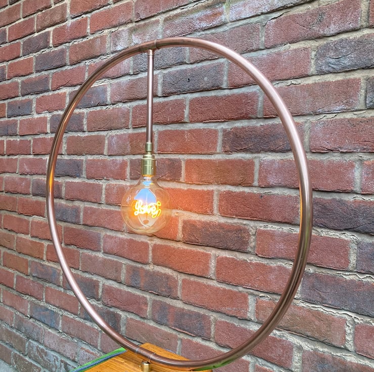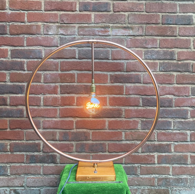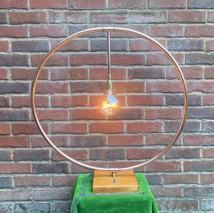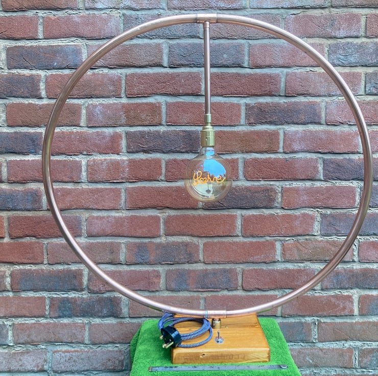 A statement table lamp, made from repurposed copper water pipe, which combines contemporary, industrial and steampunk styles. I have grafted two tee pieces into an 80cm diameter hoop made from 22mm copper water pipe, secured it to a wooden base and fitted a new solid brass lampholder to hold a Two Watt LED globe lamp with a script filament in the shape of the word ‘Love’ in the centre of the hoop. This reflects the light from the polished copper to form an attractive halo effect.